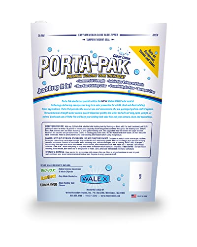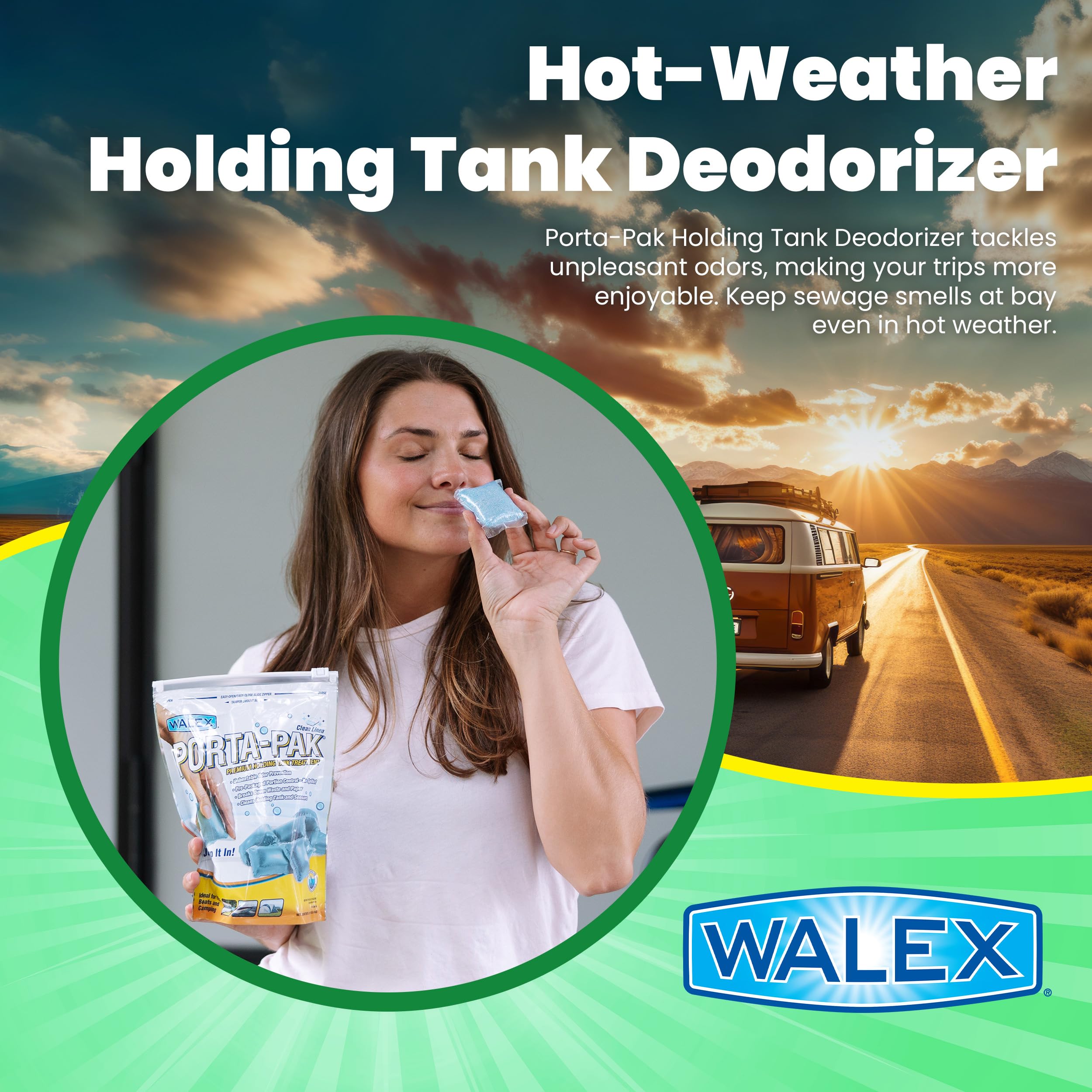 Tired of battling unpleasant odors and struggling with clogged black tanks? Look no further than Porta-Pak RV and marine holding tank deodorizer, your ultimate solution for a pristine and RV or marine experience. Porta-Pak RV and marine toilet deodorizer is the ultimate marine toilet cleaner, camper tank deodorizer, portable toilet deodorizer, and black tank deodorizer for RVs and boats. Our powerful formula not only controls odors but also efficiently breaks down paper and waste. With Porta-Pak, maintaining your RV or marine black water tank has never been easier. Our innovative, water-soluble tabs are designed for your convenience. Simply drop one in, and Porta-Pak RV and boat toilet cleaner starts working immediately without any messy spills. Continued use helps pipes, valves, and seals stay working smoothly. Porta-Pak marine and RV black tank pods are environmentally responsible. Our formula breaks down naturally, ensuring you leave a minimal footprint on the outdoors. Upgrade your RV or boat with Walex Porta-Pak RV black holding tank deodorizer drop-ins. Take control of your tank, eliminate odors, and enjoy the outdoors to the fullest.