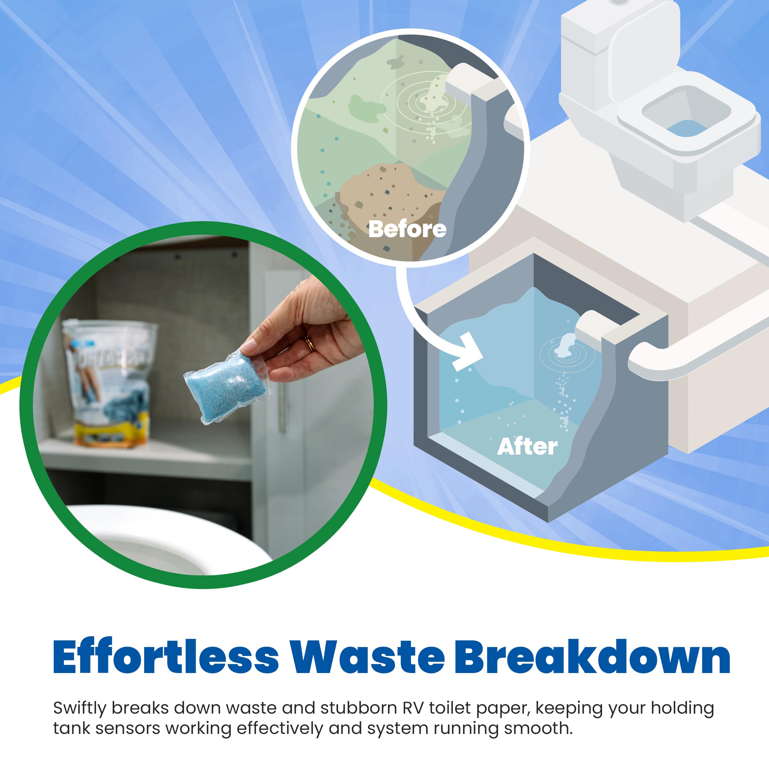 WASTE BREAKDOWN - Porta-Pak RV Marine Holding Tank Deodorizer breaks down waste and stubborn RV toilet paper, keeping your holding tank sensors working effectively. No more clogs or backups.