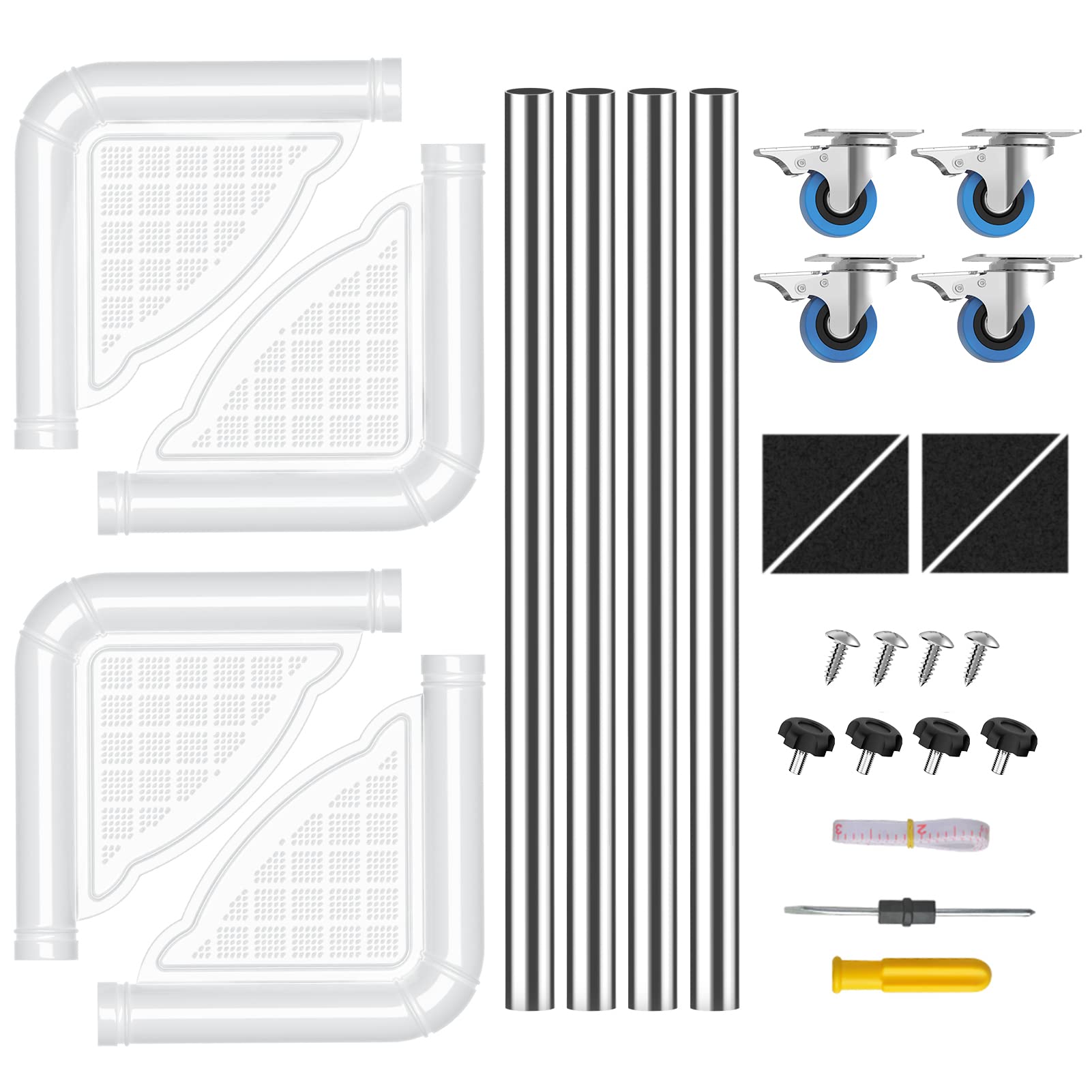 【Product Parameter】- Furniture dolly fridge stand height: 3-3/4 inches. Weight limit: 300 lbs. Fridge stand accessories : 4 locking swivel wheels, 4 sturdy PVC corner pieces, 4 sturdy steel poles and screw tool. Installation notice: Just rotate and push it into the hole after take a steel tube to align the hole.