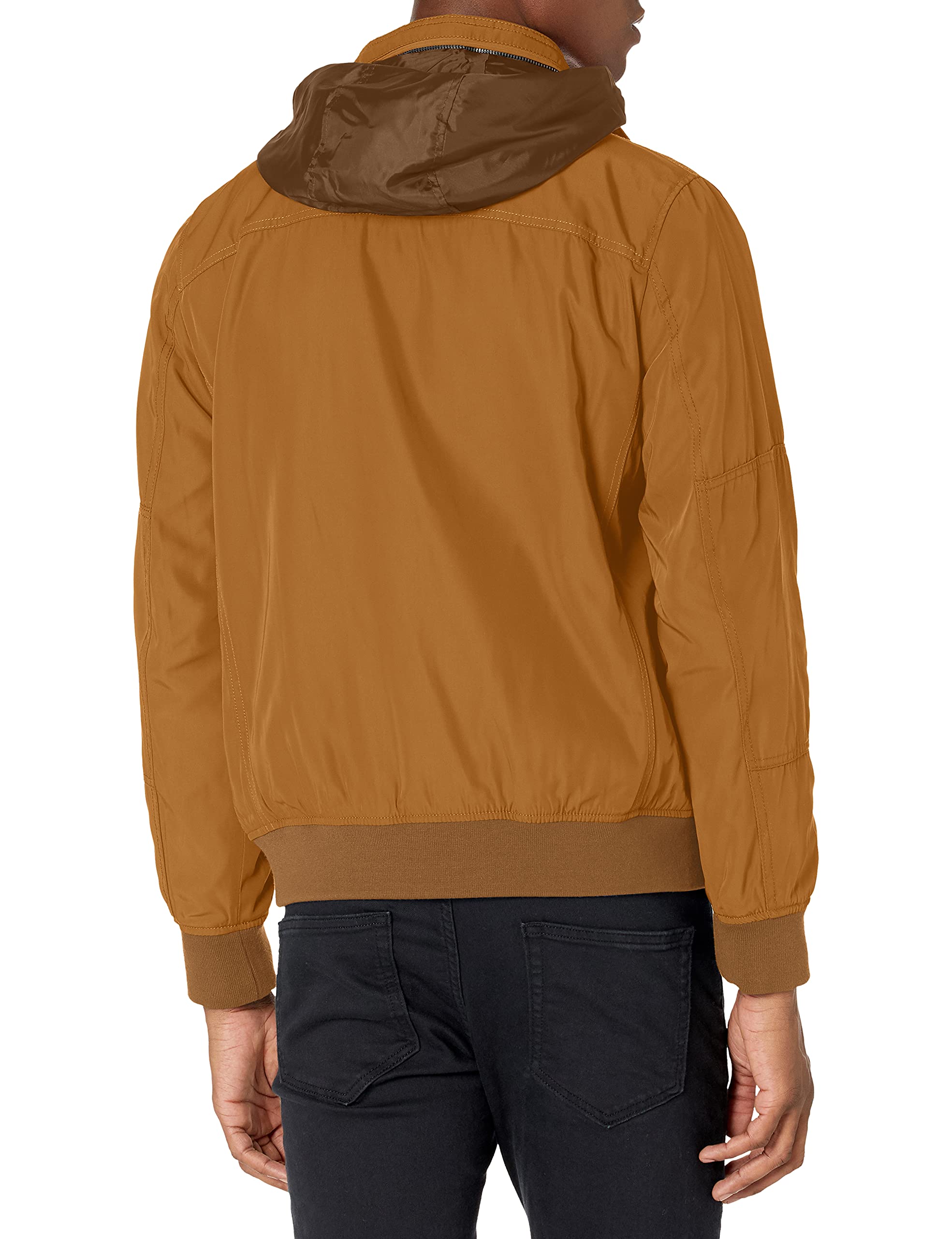 Description Poly twill four pocket performance mid-weight rib knit zip front bomber jacket with utility collar and hidden hood. Contrast quilted lining with light poly fill insulation.