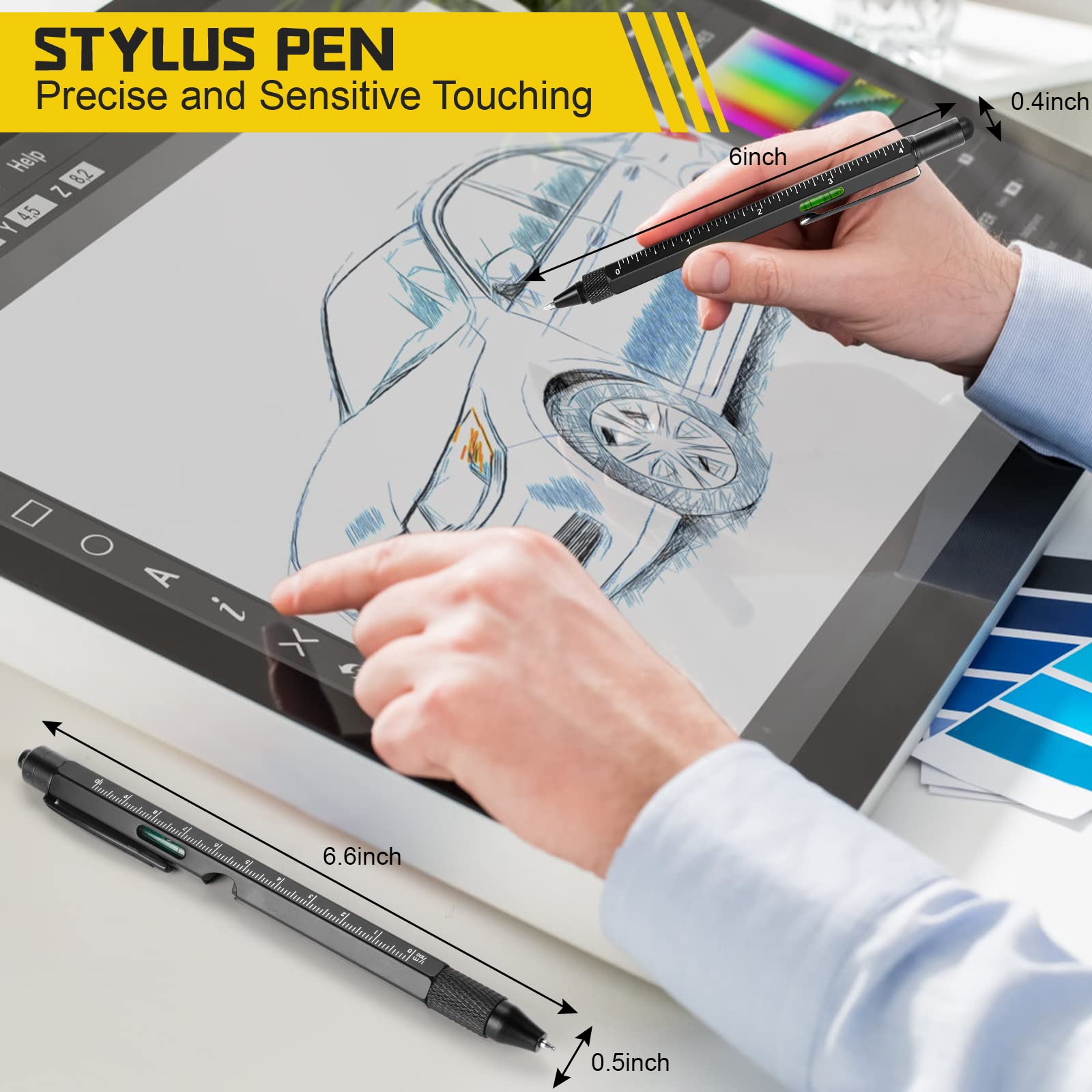 Versatile Multi-Tool: LED for dark spaces, screwdrivers for various screws, stylus for touchscreens, and bubble level, ruler, and pen for home improvement. Includes a SIM card removal tool for added functionality