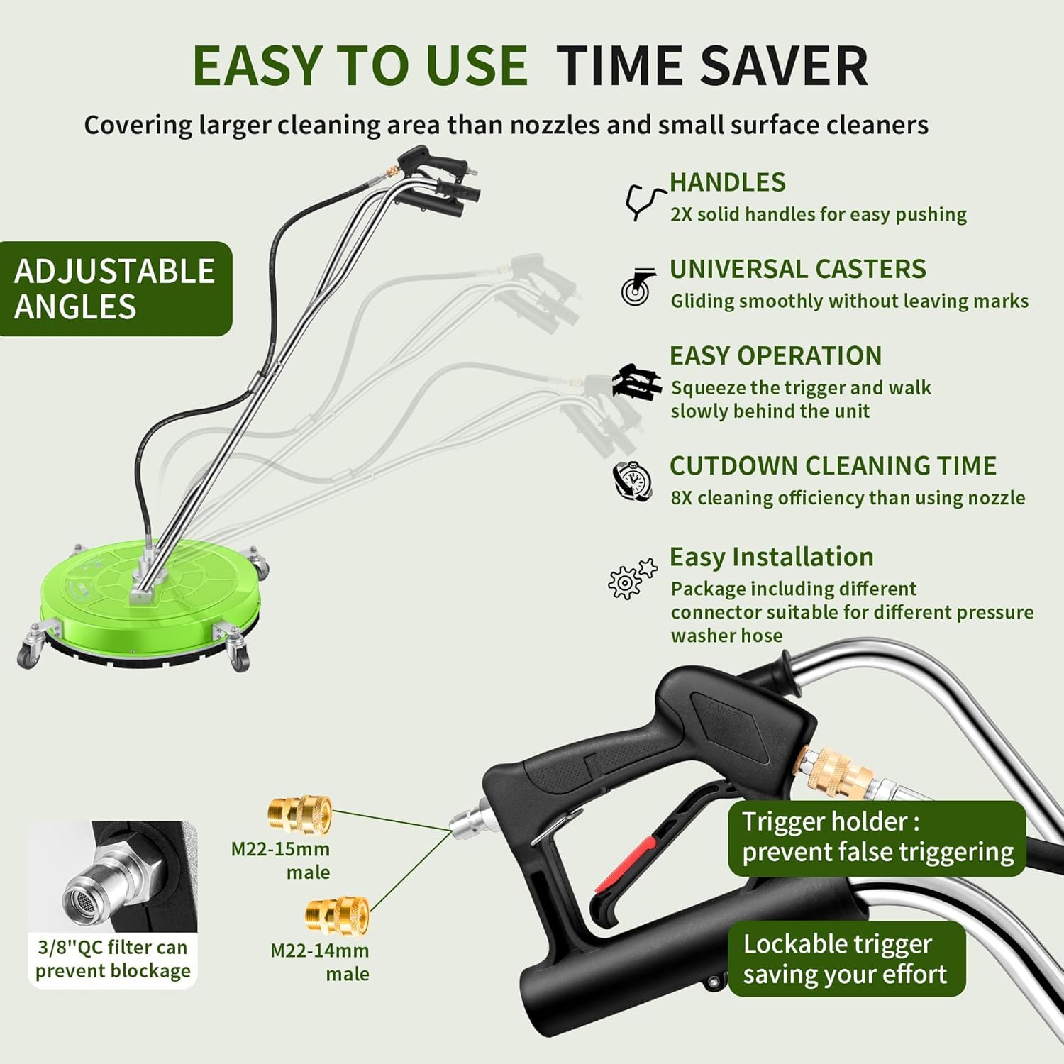 BROAD COMPATIBILITY – Works with gas/electric pressure washers (2,000-4,000 PSI). Features a 3/8'' QC inlet and 2 hose adapters to fit most power washer hoses. Trigger-lock design maintains continuous operation for effort-free use. Built-in debris filter prevents clogs for uninterrupted cleaning.