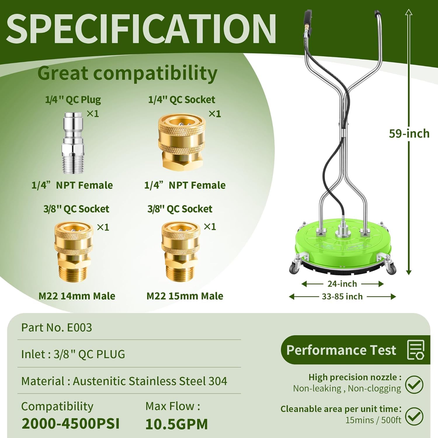 ESSENTIAL ACCESSORIES – Includes 4 replaceable nozzles (easy to remove/maintain), a 1/4" quick-connect set for fast setup, plus 3/8" QC to M22-14/M22-15 fittings, Teflon tape, and a nozzle cleaner.