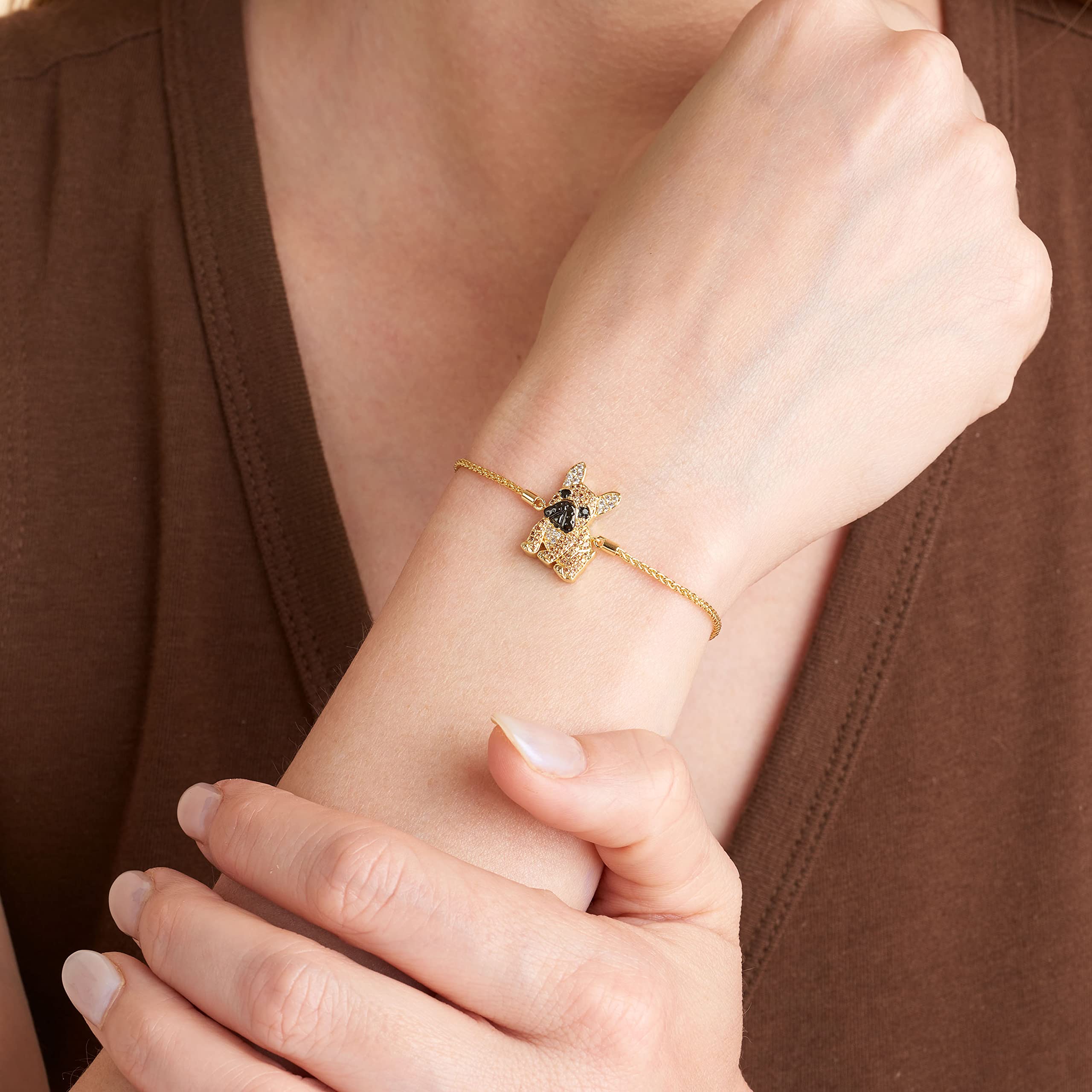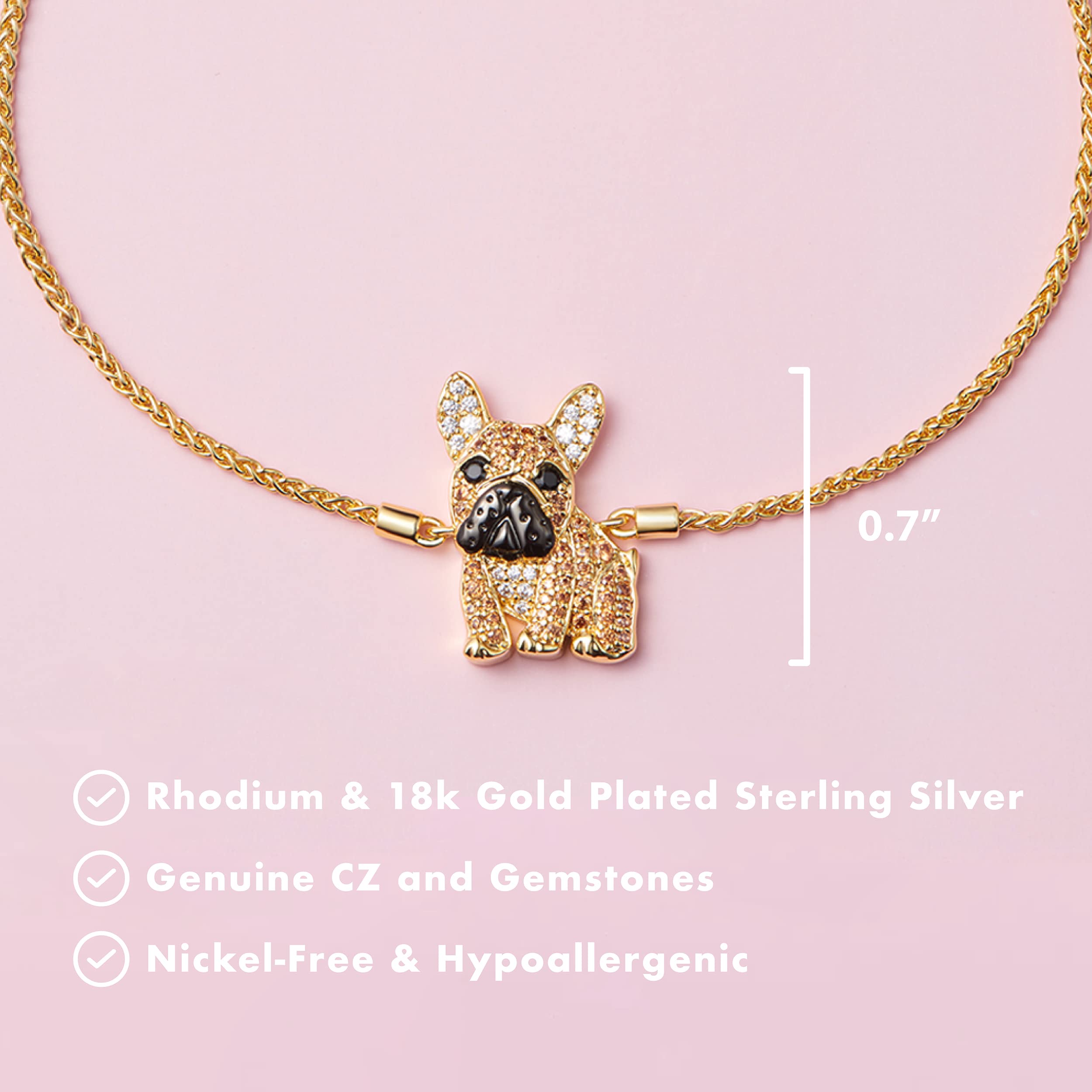 The adorable French Bulldog charm features a precious Frenchie breed design with sparkling white and champagne cubic zirconia and genuine black spinel eyes, a dainty 0.7 in x 0.5 in