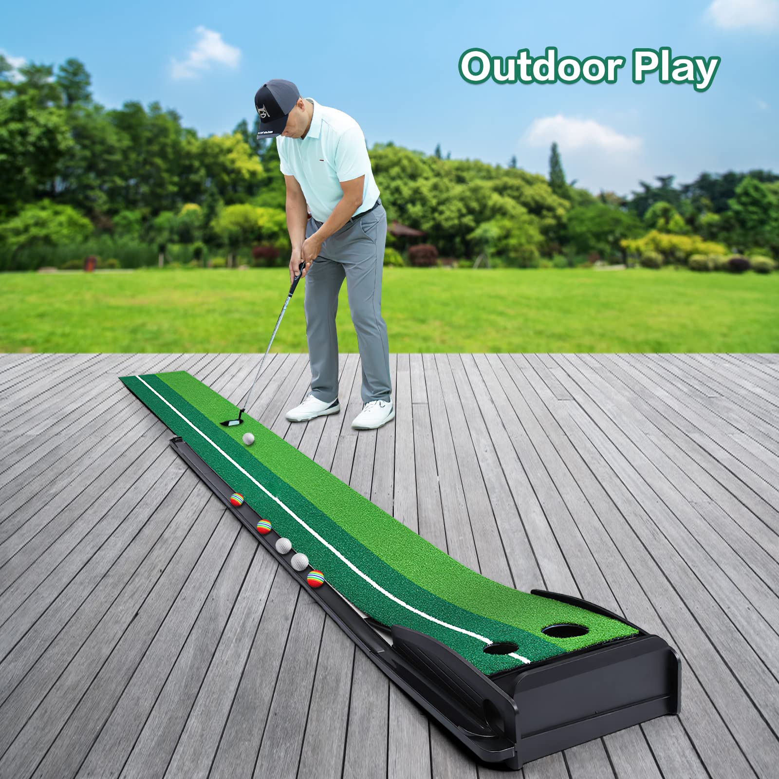 【Auto Ball Return & Extended Rail】 - The golf green is equipped with an automatic ball return function to save the trouble of picking up the ball back and forth. The extended track provides the ultimate comfortable training experience.
