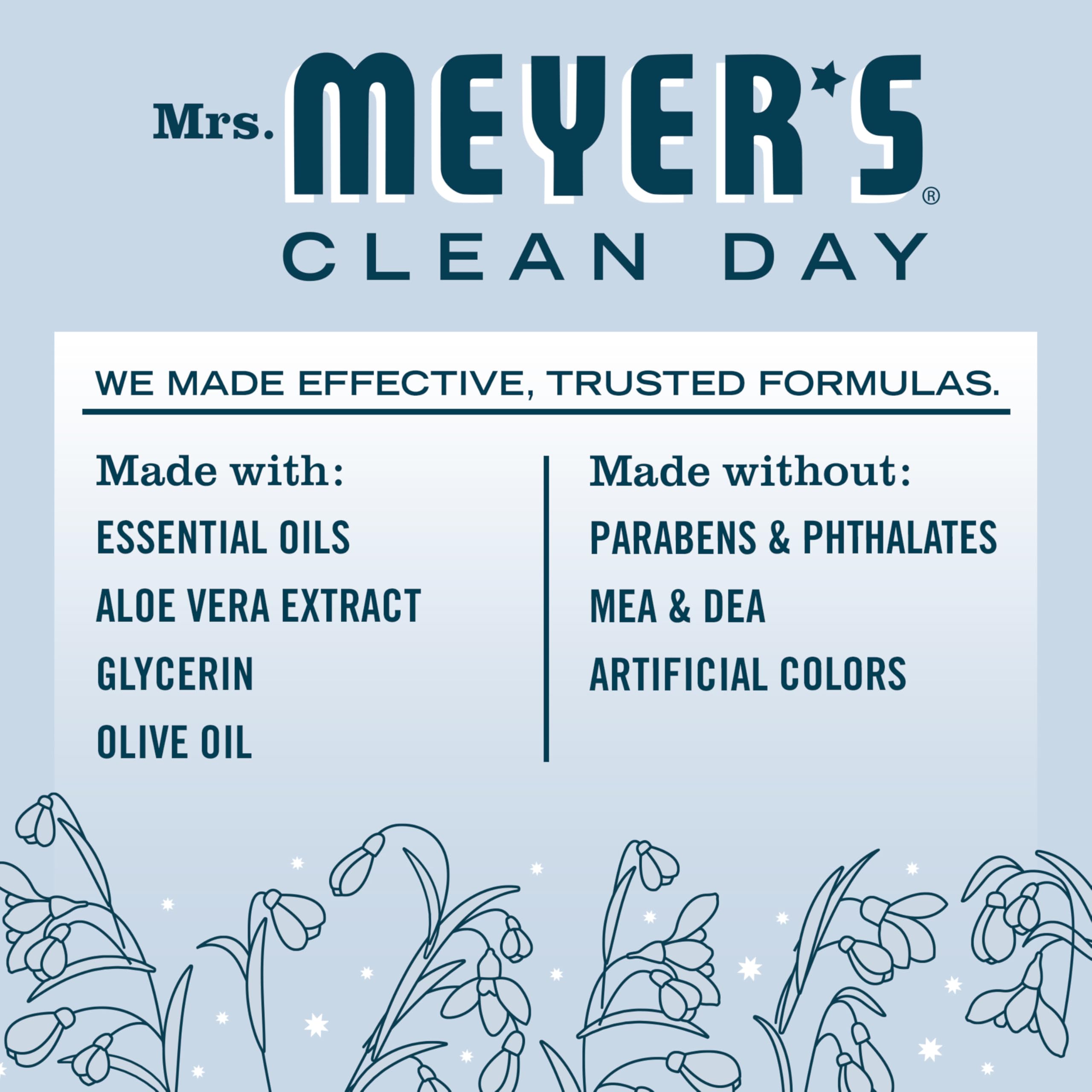 Itβs that time of year again! And weβre so excited. Why? Weβre glad you asked. Weβve come up with a lovely new limited edition scent for our Mrs. Meyerβs Clean Day Liquid Hand Soap Refill: Snowdrop. And itβs just in time for the special season. Oh, pretty and light Snowdrops. Theyβre a wintry delight. Fresh Snowdrops are so joyful, braving the cold with their bright white bell-shaped blooms. Our special, limited edition Snowdrop scent will bring a fresh, clean and seasonal scent to your home. It features the sweetness of orange and mandarin, mixed with white grapefruit and the cool florals of iced petunia. Flowery notes of poinsettia and white jasmine tea are warmed with a hint of wood. Itβs a frosted floral scent picked fresh for winter. This hardworking Hand Soap formula contains olive oil, aloe vera, and essential oils, and thoughtfully chosen ingredients that clean and freshen hands. Made without parabens, phthalates or animal-derived ingredients and always a cruelty-free formula soap. Also available in other garden-inspired scents and products such as Dish Soap and Multi-Surface Cleaner. Mrs. Meyer's - Rooted in Goodness.