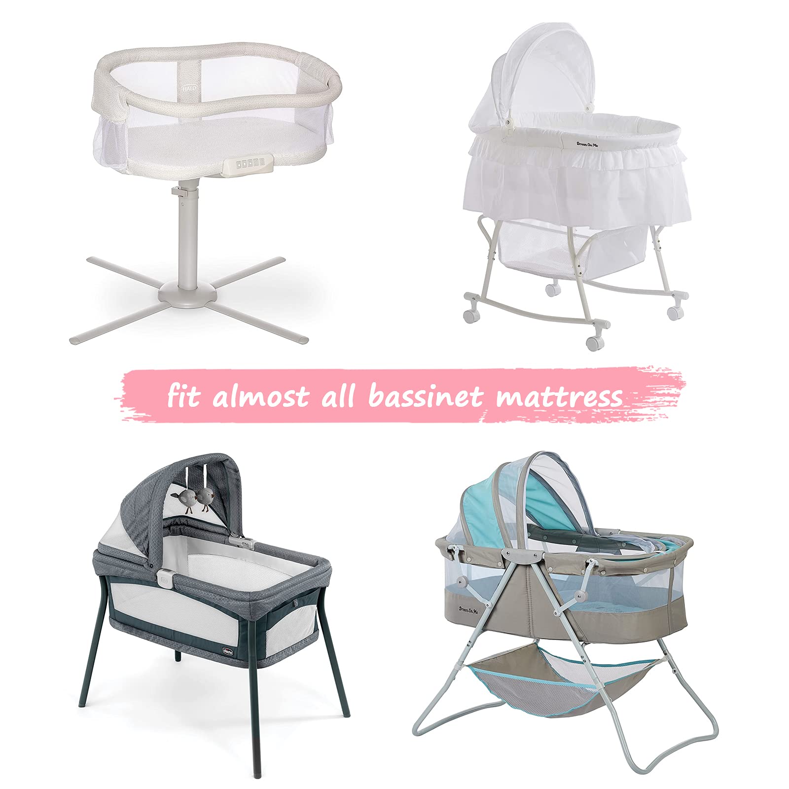 Not Only Fitted, But Snug: Measuring 32”x17”x5.5” Our satin bassinet sheets fit almost all standard oval, round, rectangle, hourglass shaped bassinet mattress such as brand including Halo, Baby Bjorn, Chicco, Fisher Price, Ingenuity, Evenflo, Graco, UppaBaby, Delta & Nuna Sena. Each sheet comes with an elastic band encased at the bottom for safety.