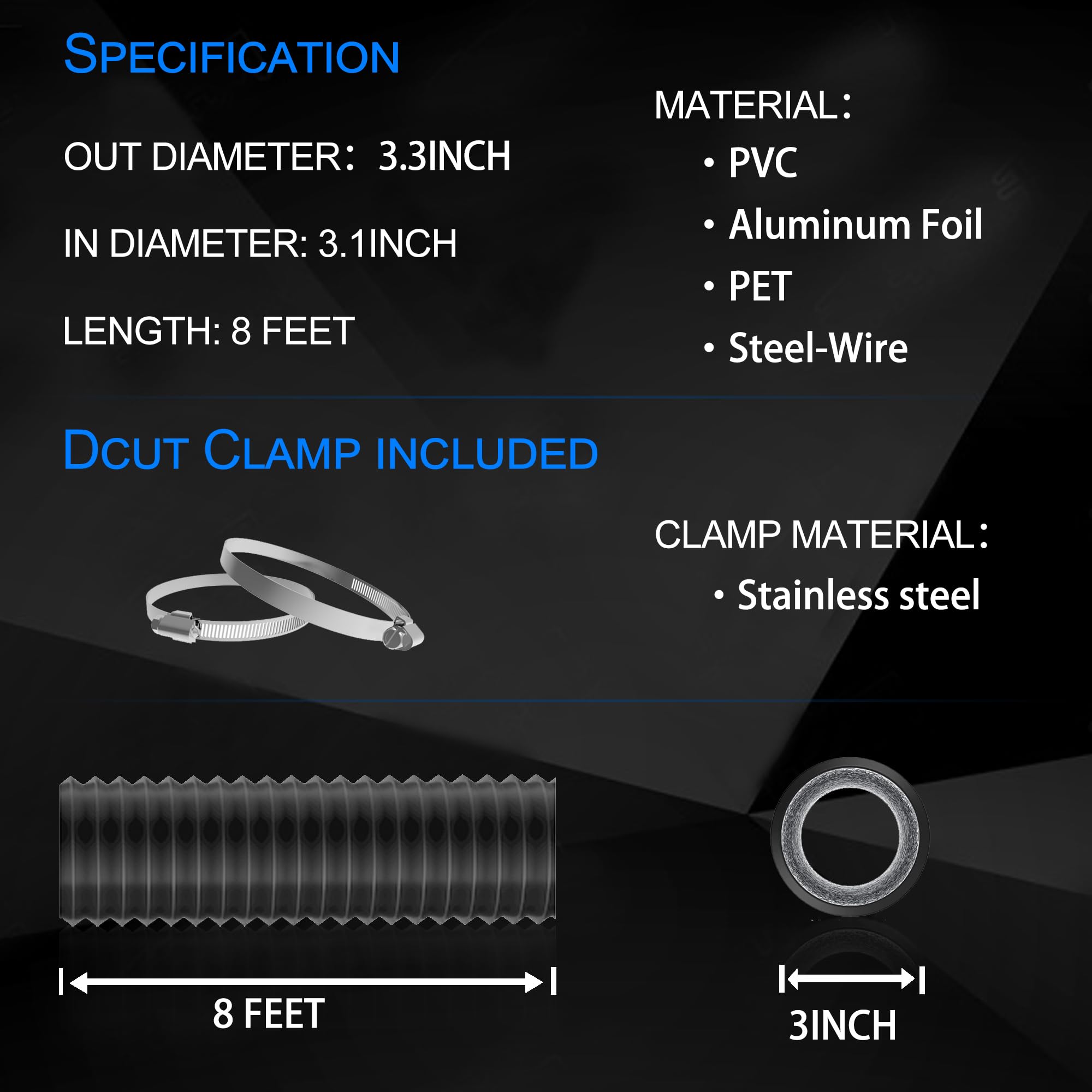 [Material]:The Dryer Vent Hose is made of ( Aluminum Foil + PET +Steel wire+ PVC),The hose steel wire diameter is 1mm prevent deformation.The PVC film help to be light-proof,noise reduction and Insulation.