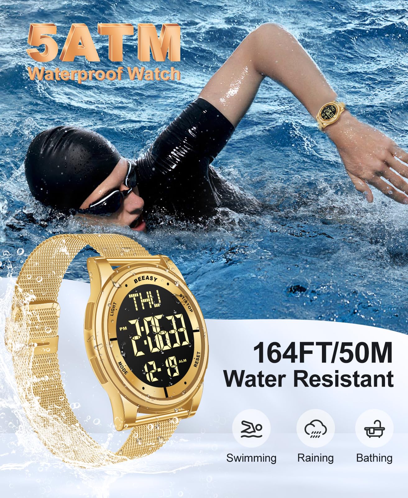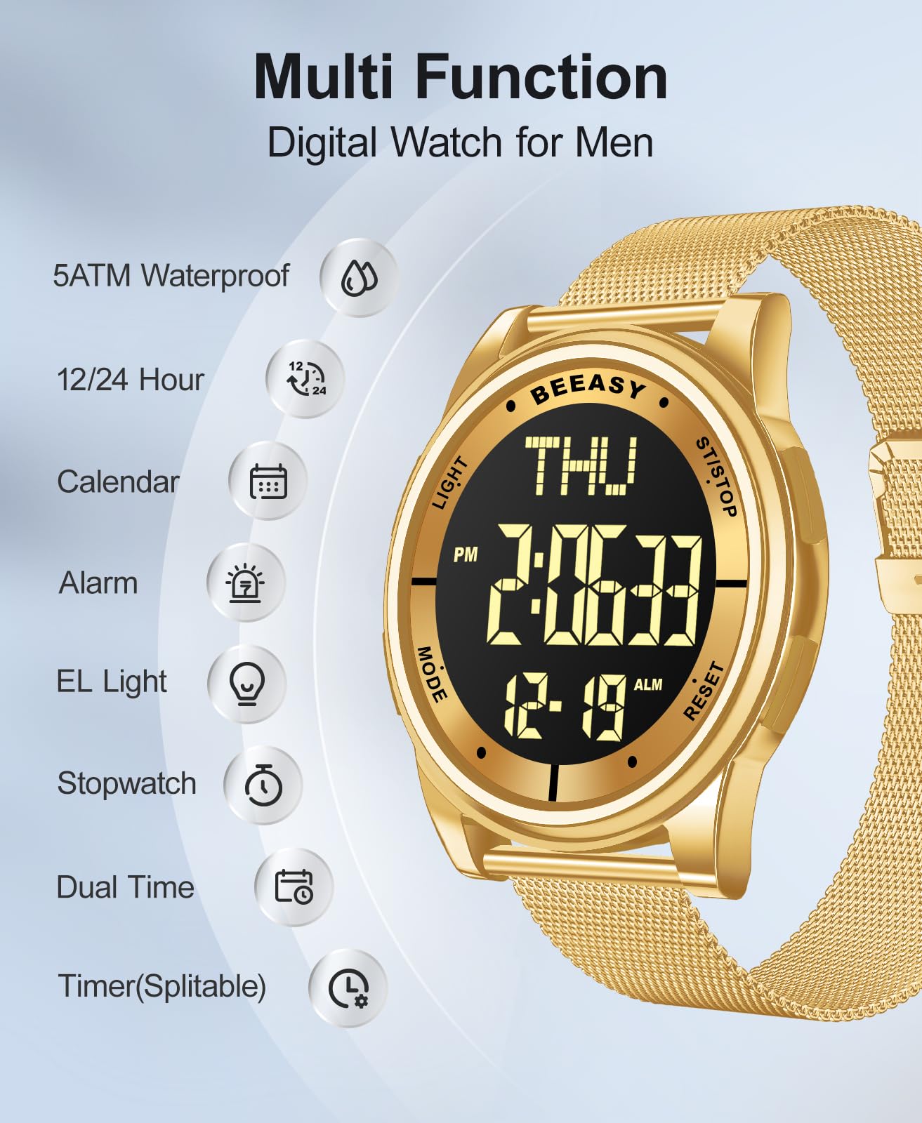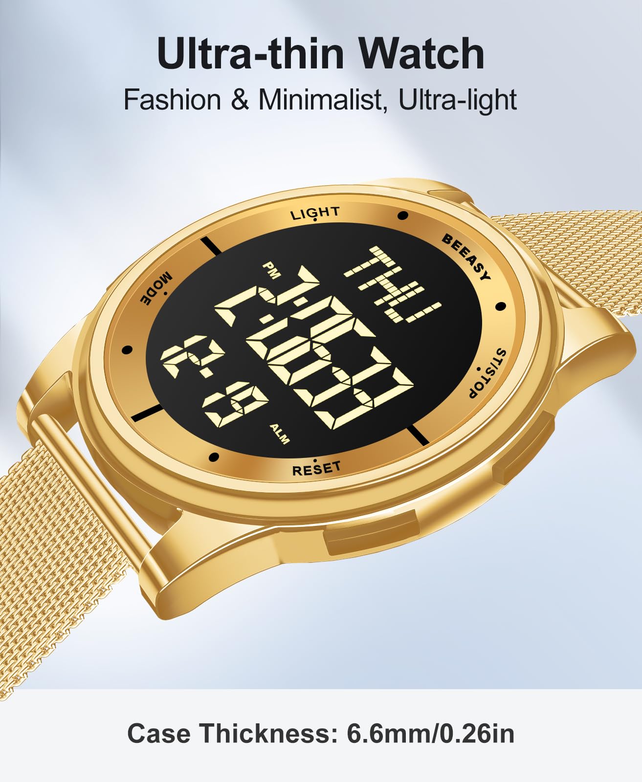 Description Ultra-Thin Digital Watch – Sleek, Waterproof & Multi-Functional Versatile & Stylish Design Designed for both men and women, this ultra-thin (6.6mm) digital watch combines modern minimalism with high functionality. Its sleek case and textured band offer a lightweight, comfortable fit for all-day wear. Crystal-Clear EL Backlight Display Features a wide-angle digital screen with bright EL backlight, ensuring effortless readability day or night. Perfect for low-light conditions, workouts, or travel. 50m Water Resistance – Swim & Shower Safe Built for active lifestyles, this watch is waterproof up to 164ft (50m), making it ideal for swimming, showering, and rainy weather. Smart Multi-Function Features 12/24-hour time format Date & day display Alarm, stopwatch, and countdown timer Dual time zone support (great for travelers) Durable & Comfortable for Everyday Wear The scratch-resistant screen and flexible textured band ensure long-lasting durability, while the ultra-lightweight build keeps it comfortable for work, sports, or travel. Perfect for Active Lifestyles Whether you're swimming, running, traveling, or working, this digital watch keeps you on time with reliable performance and sleek style.