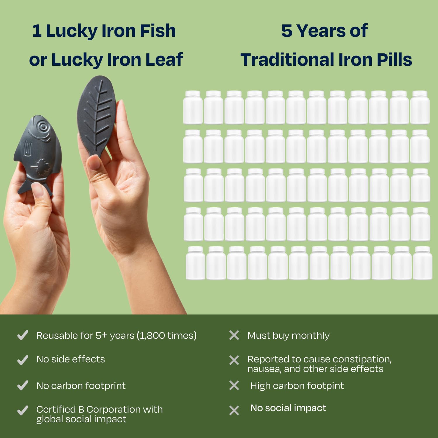 Quick and Easy --- The Fish and Leaf shapes provide the same amount of iron. You can make iron-fortified water to drink or cook with daily. Rice, oats, smoothies, & even ice can now be your source of tasteless iron! To fortify liquid-based meals like soups, stews, sauces & curries add the Lucky Iron Leaf in the pot for 10 minutes.