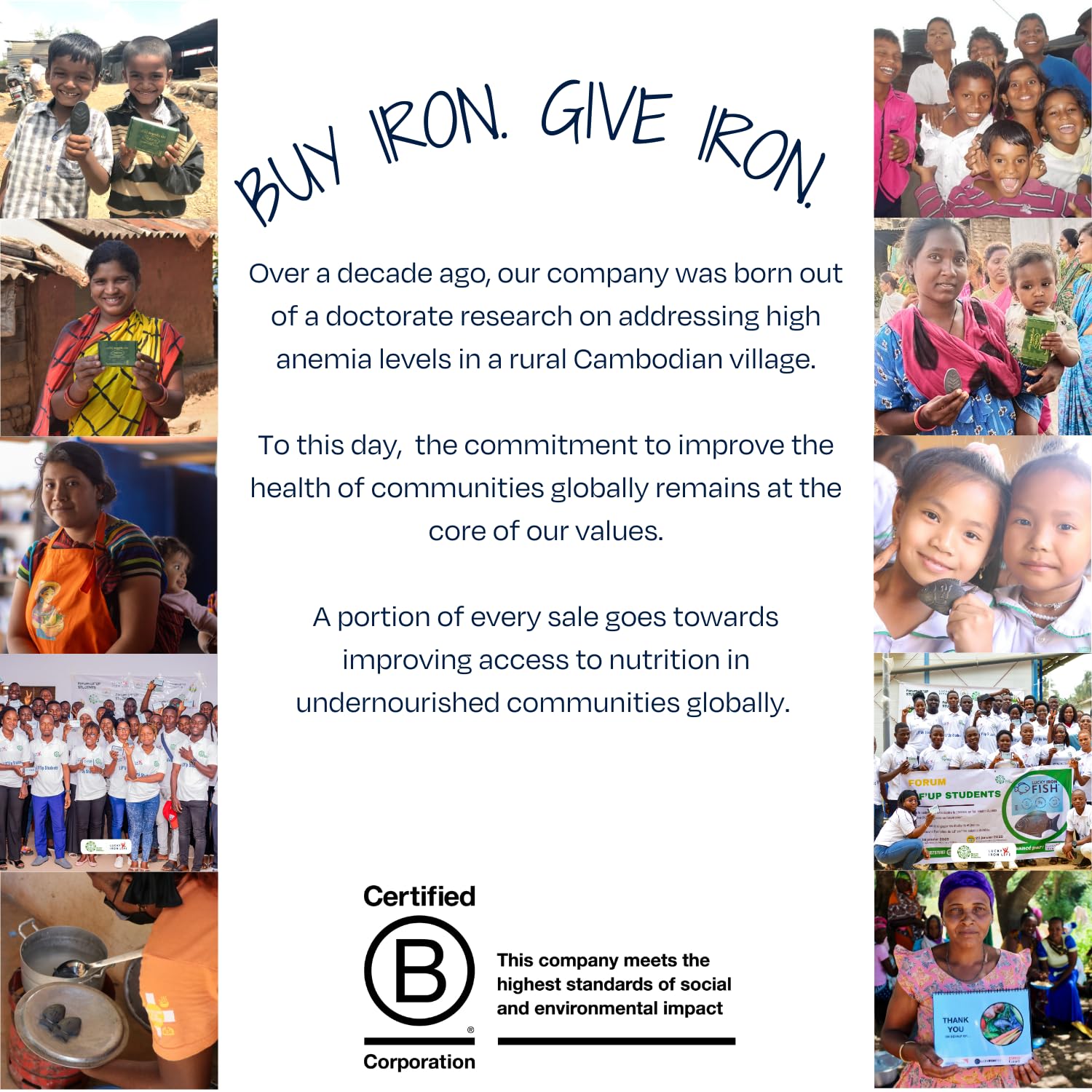 Impact ---Your purchase helps undernourished communities get their own Lucky Iron Life for improved energy, immunity, and concentration leading to better performance in school and work. Thank you for supporting our cause!