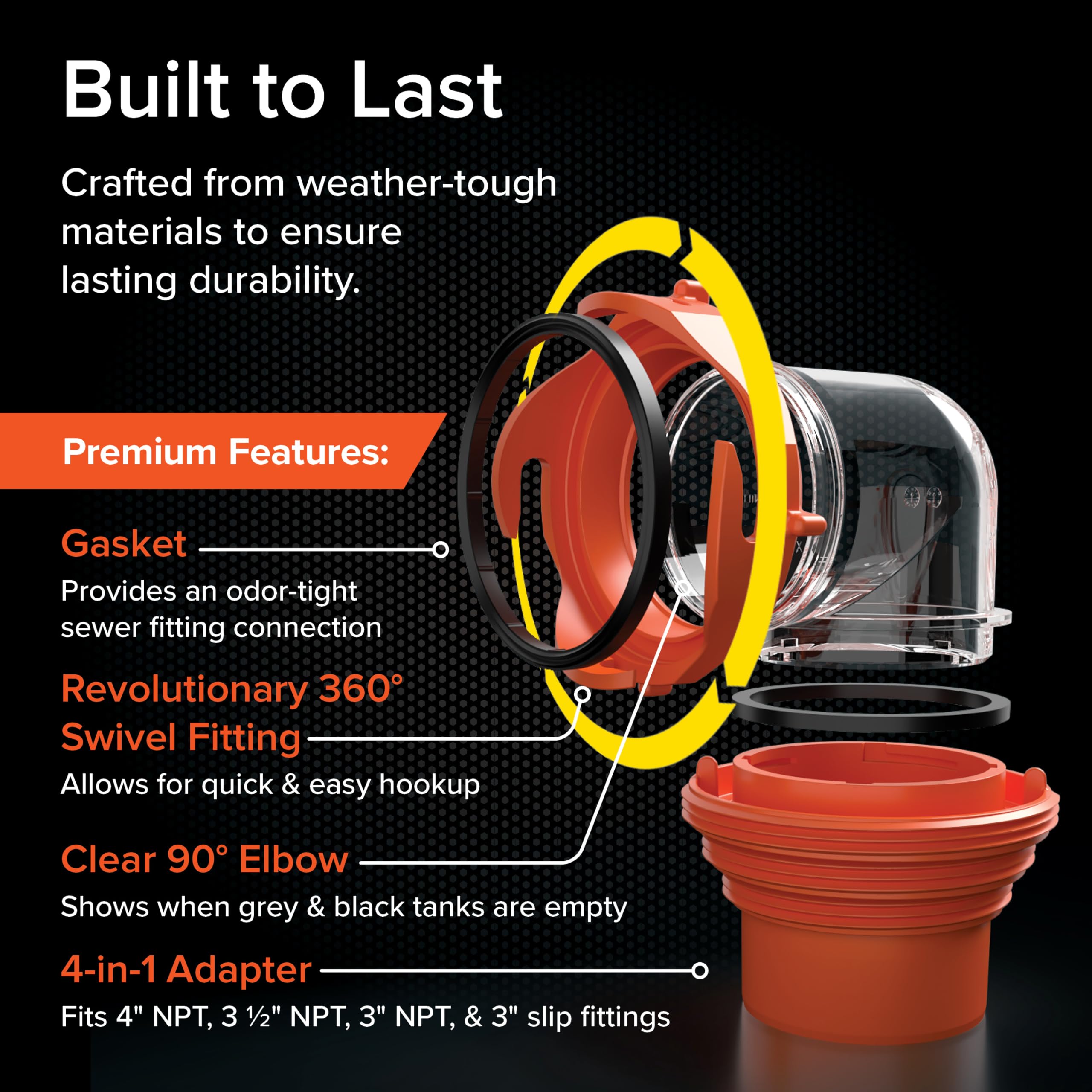 Transparent Elbow: Easily monitor when your sewer hose has finished draining your black tank/grey tank with the clear 90-degree hose elbow. This RV sewer hose fitting’s clear Construction simplifies the dumping process, eliminating guesswork.