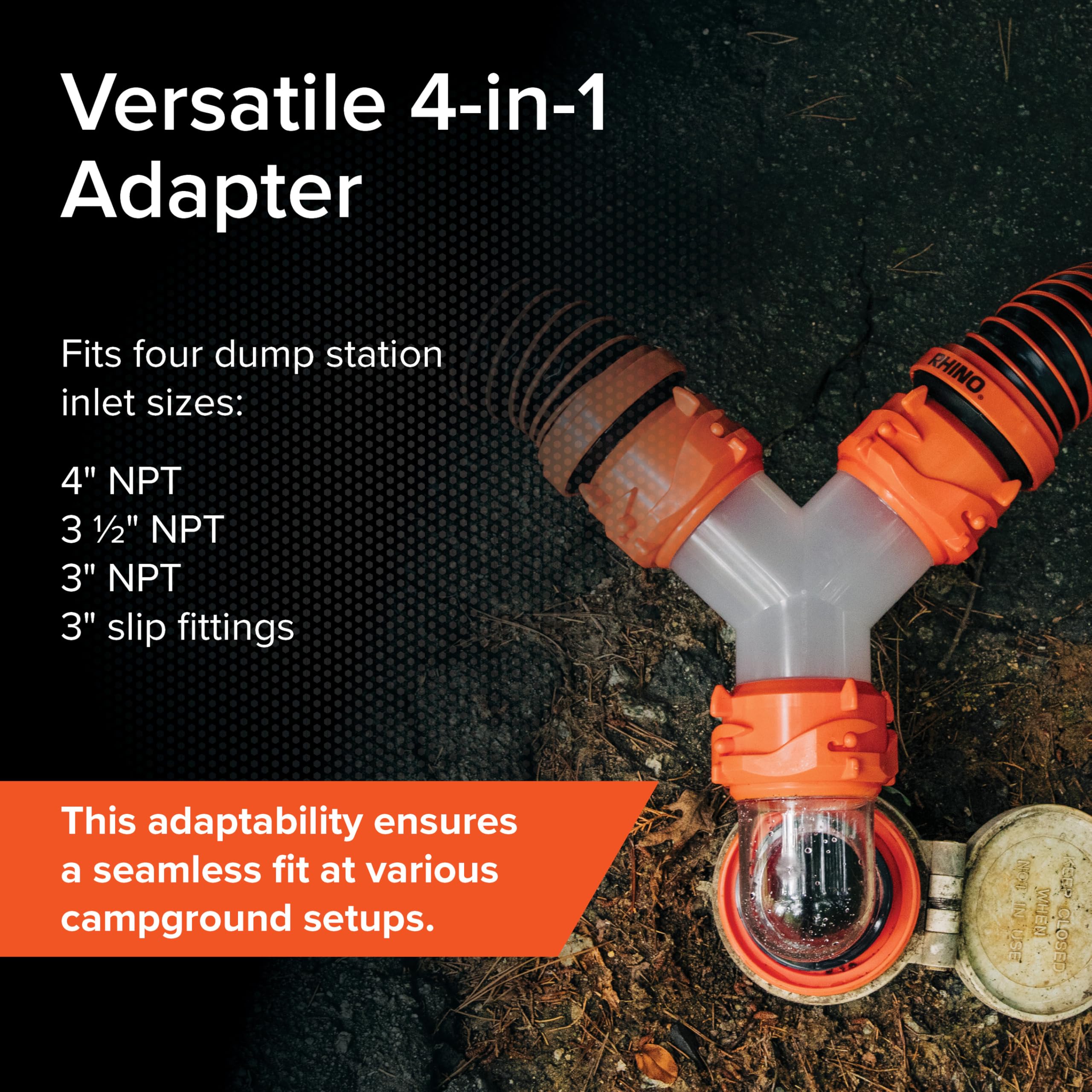 Versatile Adapter: The innovative 4-in-1 adapter is designed to accommodate four different dump station inlet sizes— 4" NPT, 3 ½" NPT, 3" NPT, and 3" slip fittings. This versatility ensures a seamless fit at various campground setups.