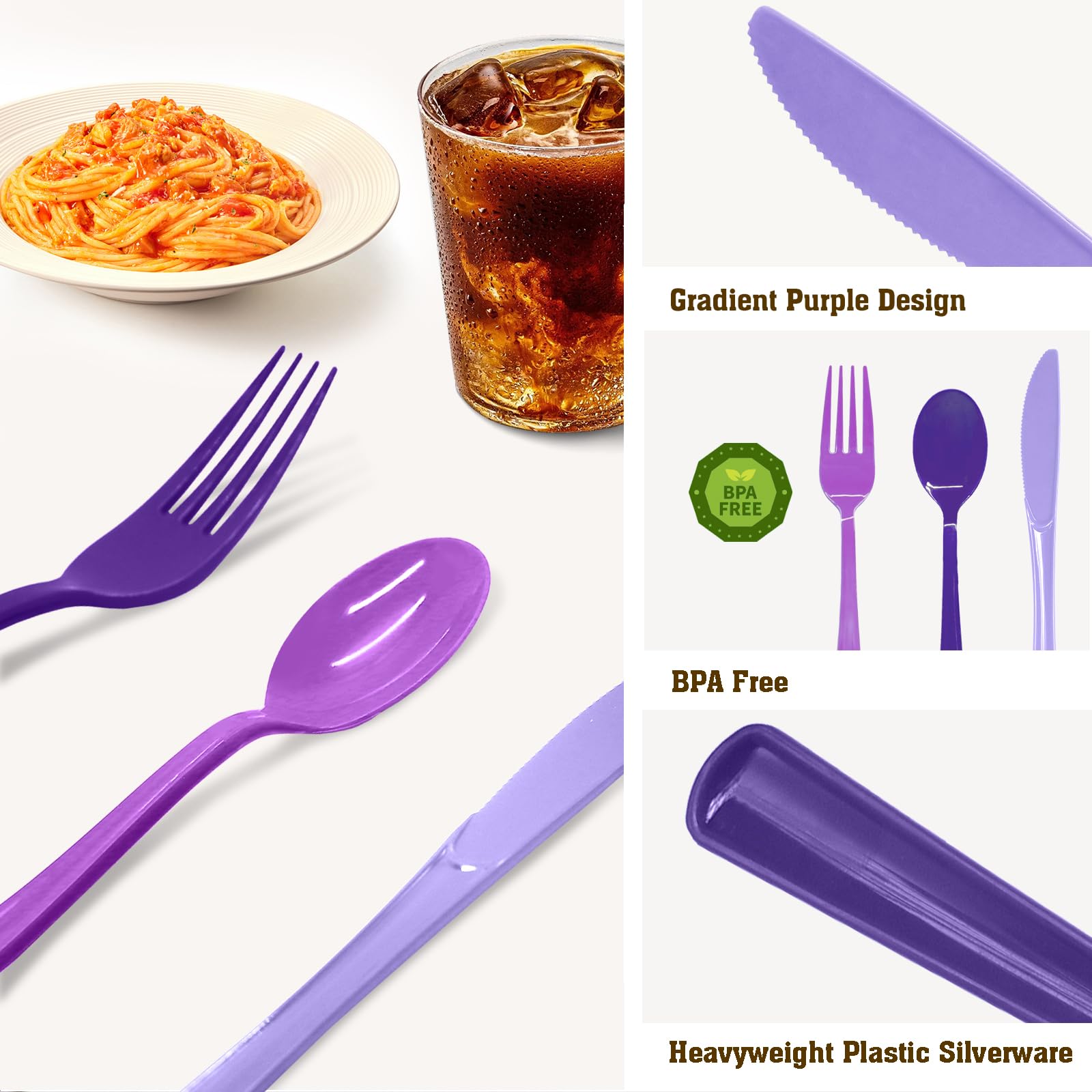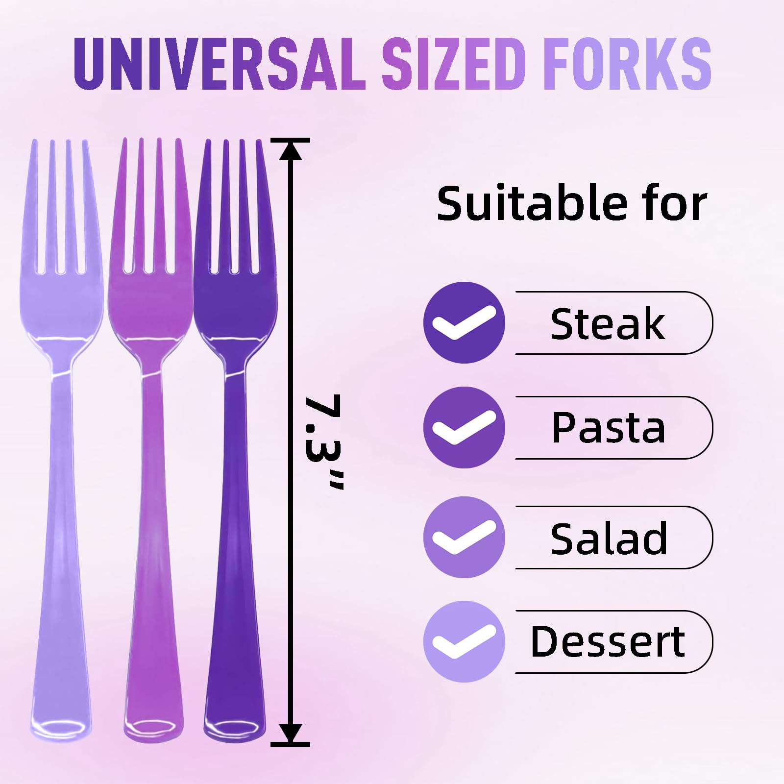 【Gradient Color Aesthetics】: This purple plastic forks features a gradient design that transitions from light to dark shades, adding artistic flair and vibrancy to mealtime. Whether for everyday dining or special occasions like parties, it becomes a standout piece on the table, elevating the dining experience with visual appeal.