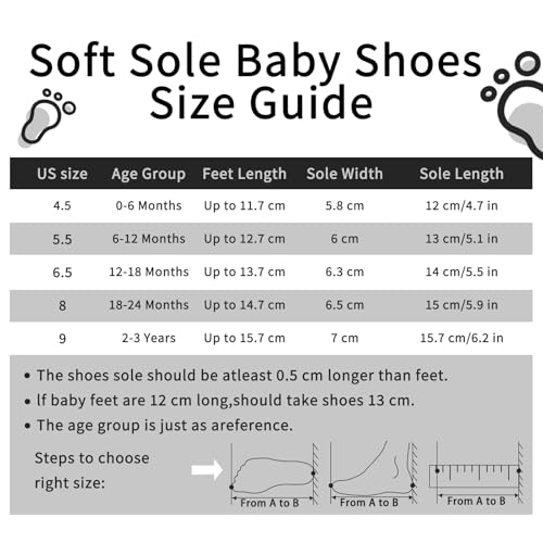 👣【Size attention】As baby feet are very soft, they are growing very fast, and need some room to grow naturally, it's better to choose a little bigger than exact size. And please choose the size by the sole length, not the age.