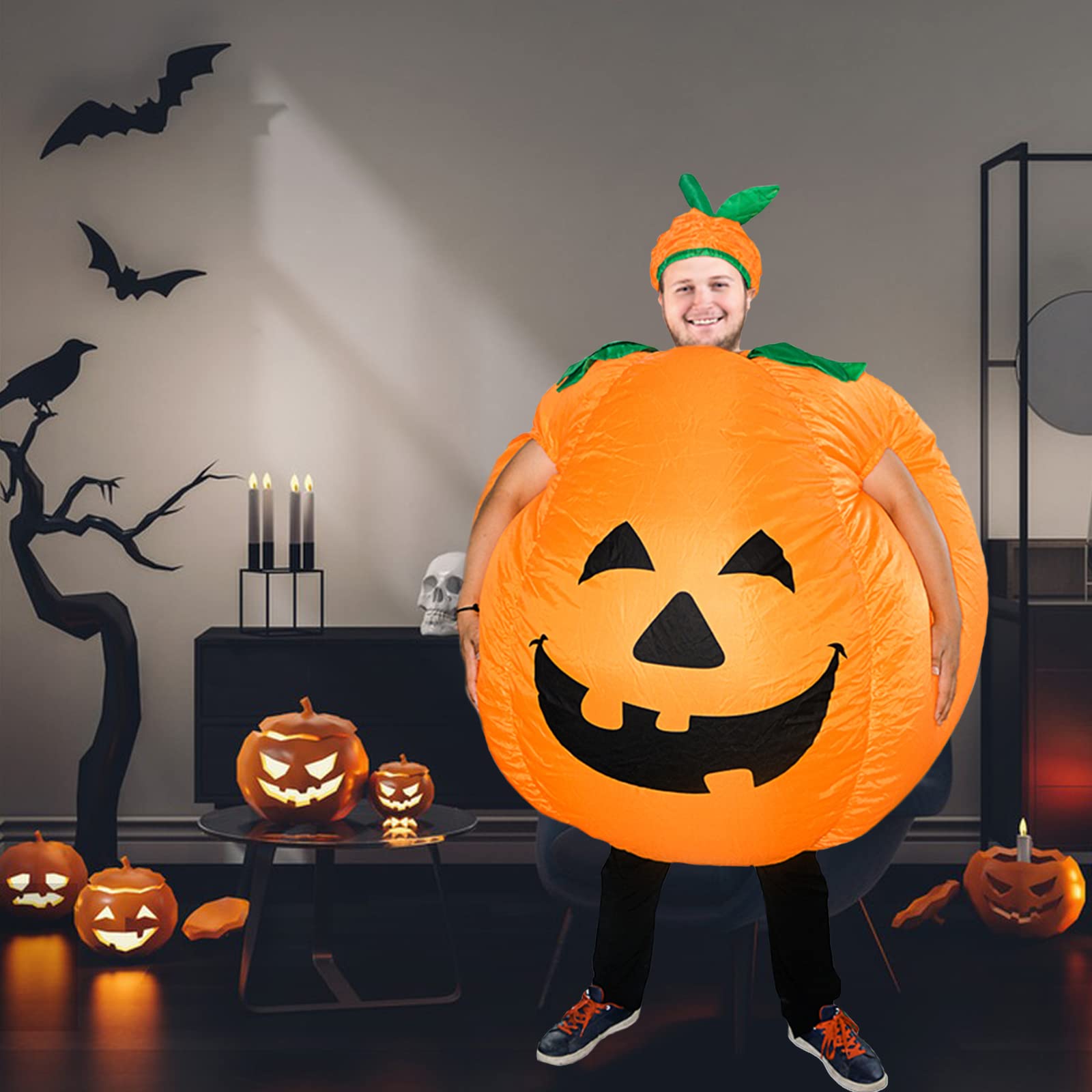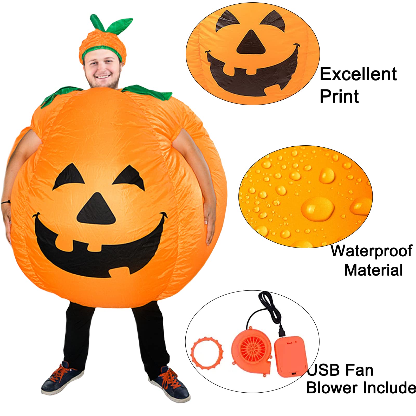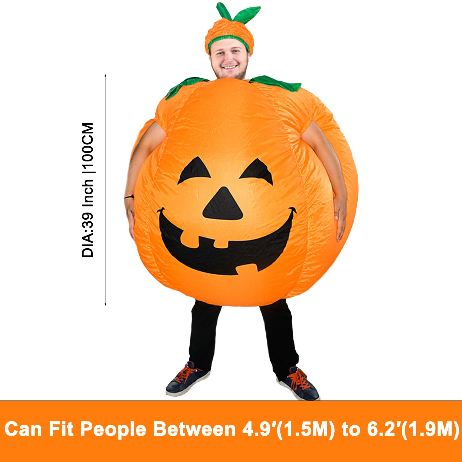 ZISUEX PUMPKIN COSTUME ADULT SIZE:The pumpkin blow up suit body suit is large and plus size design pumpkin inflatable costume suitable for the people between 4.9ft(1.5M) to 6.2ft (1.9M).halloween pumpkin costume can fit for almost people