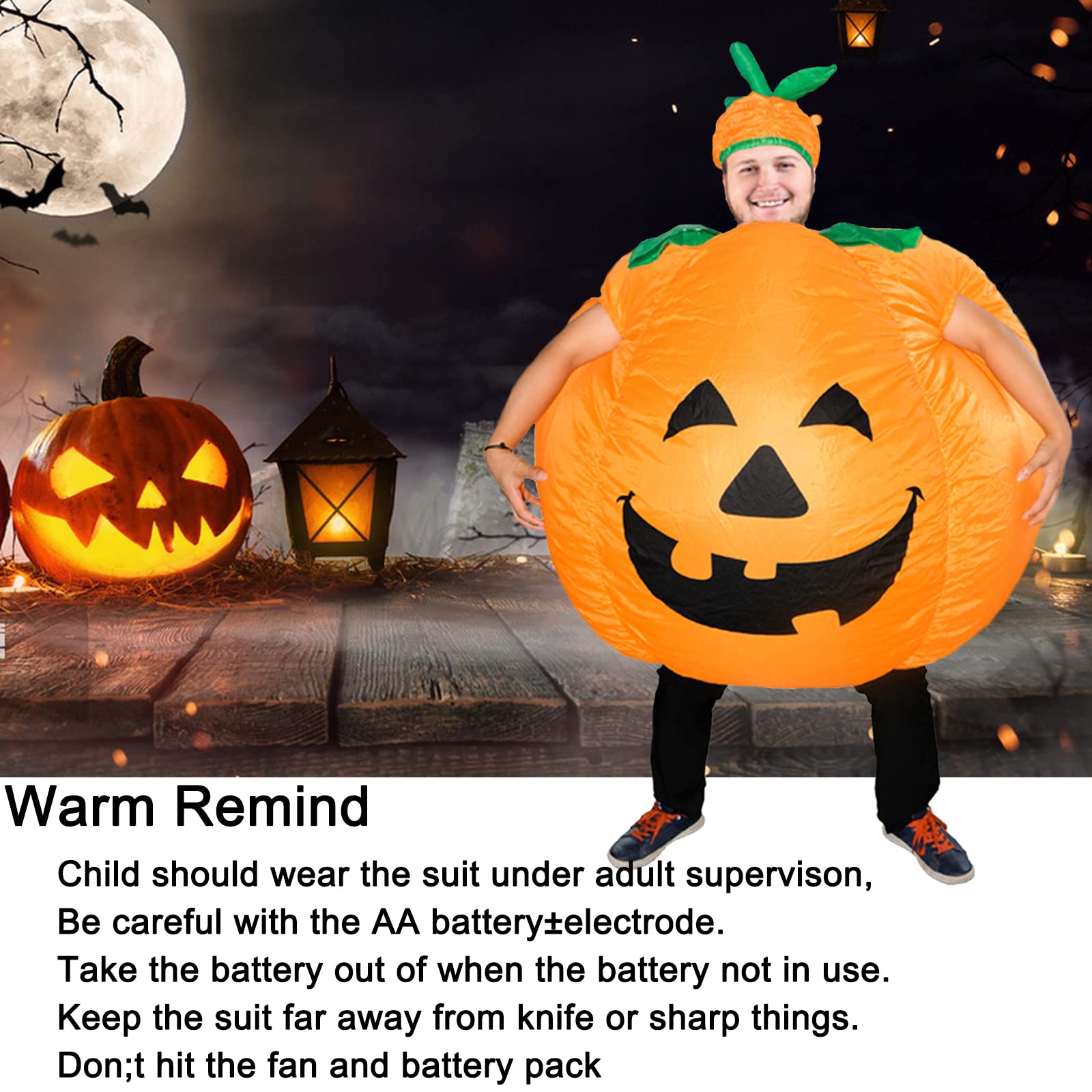 ZISUEX INFLATABLE PUMPKIN COSTUME PACKAGE INCLUDE:ZISUEX halloween pumpkin costume for adults suitable for most adults. package include 1 x inflatable costume,1 x usb mini fan blower,pumpkin suit mini fan is requires 4 AA batteries and USB connected mobile power(not including battery)