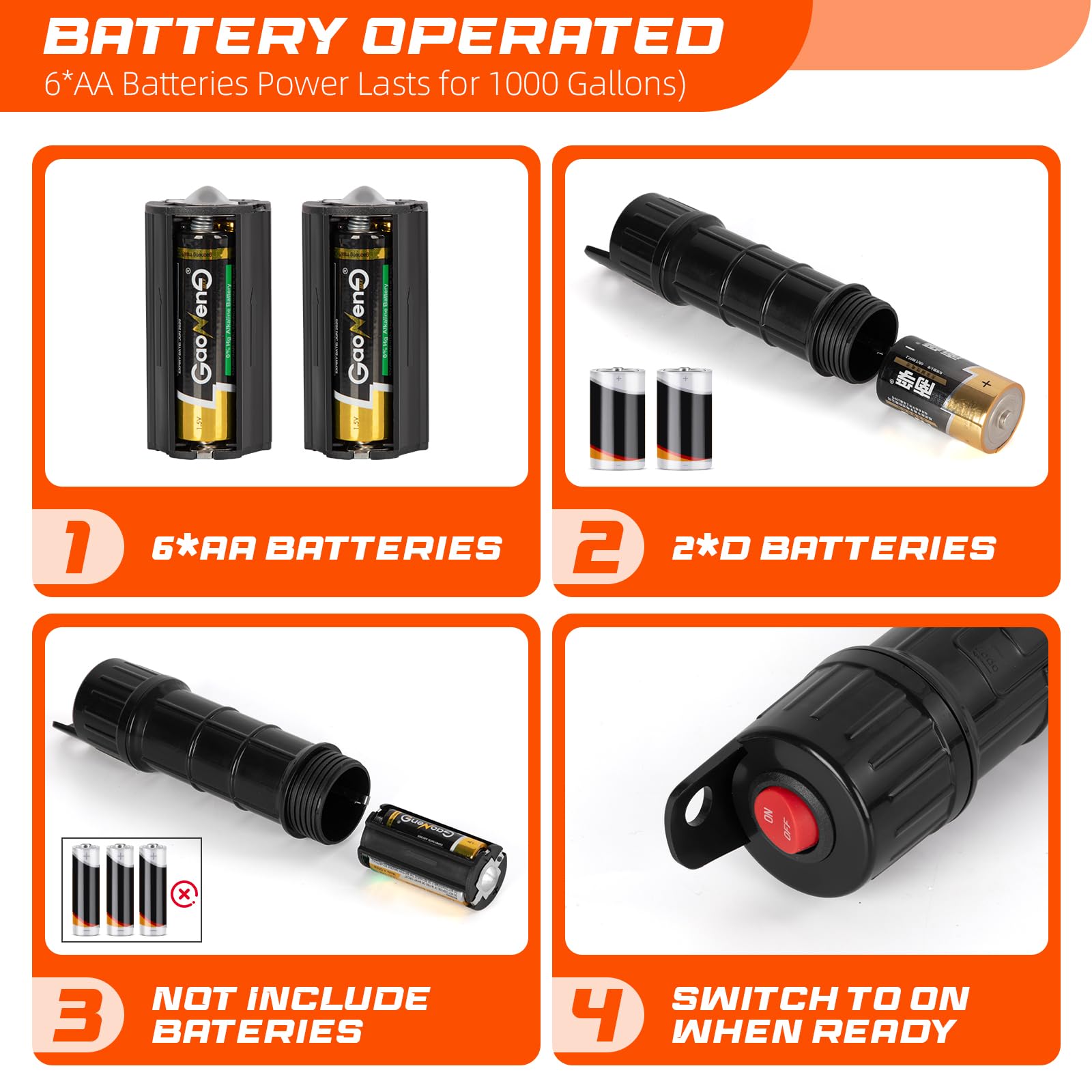 Flexibility:support 2*D Batteries Powered by either 6 AA batteries (not included), this pump adapts to any scenario. Transfer fluids effortlessly during camping trips, job site tasks, or emergencies—no electrical outlet required.