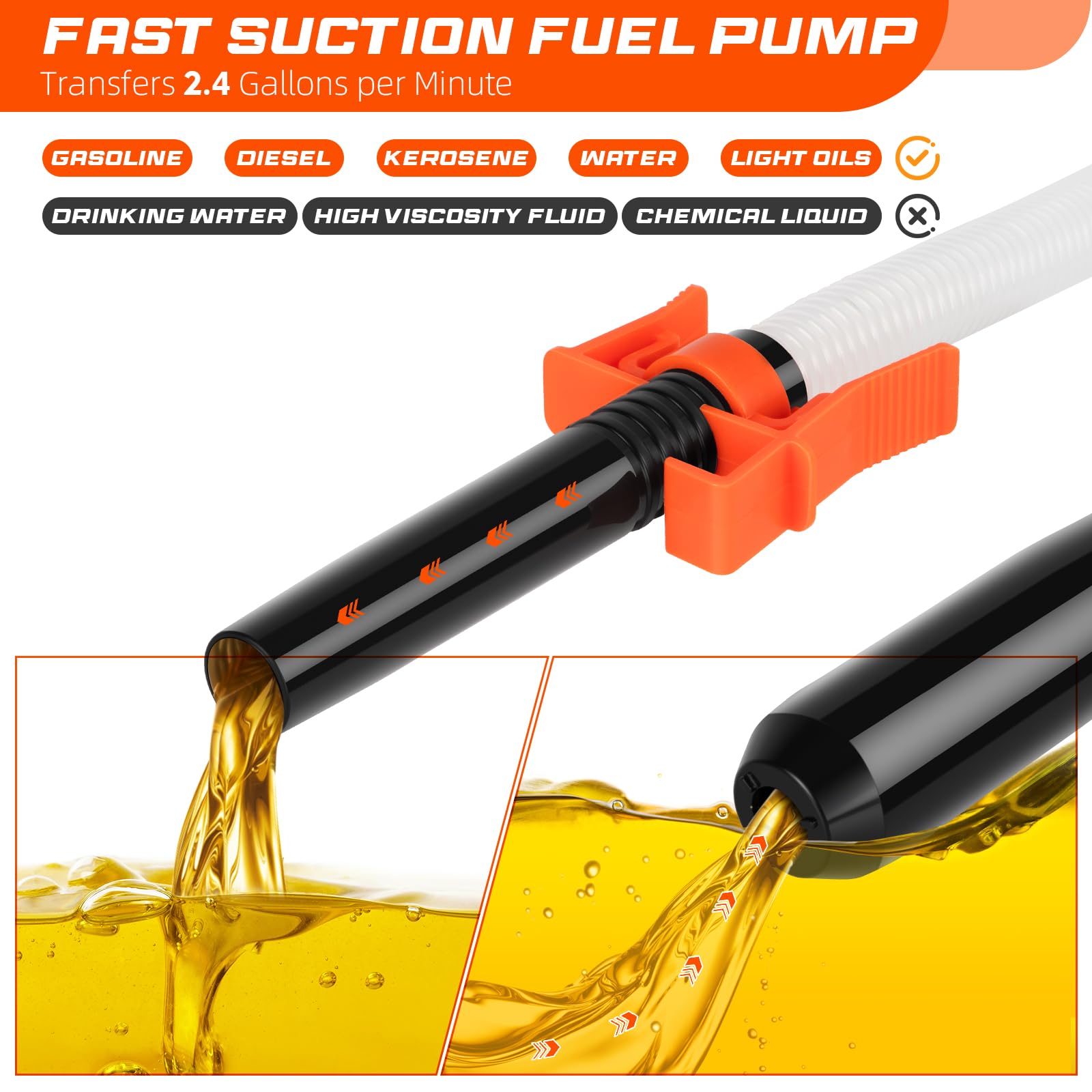 Multi-Purpose Utility:Handles gasoline, diesel, kerosene, and non-potable water. Perfect for vehicles, generators, lawnmowers, aquariums, and bathtubs—suited for recreational, emergency, and everyday use.