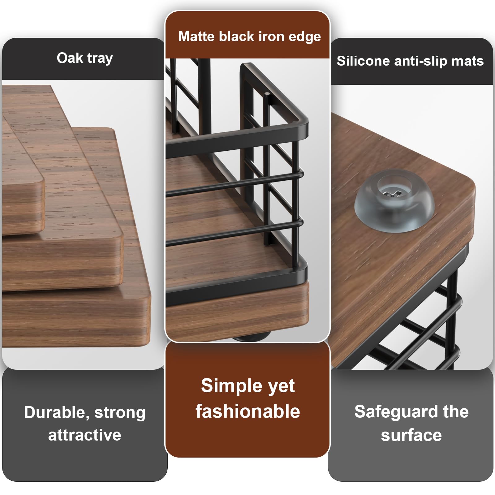 Cost-effective: No assembly required, easy to clean. The tray crafted from iron and oak is simple and attractive. The solid bottom ensures items won't fall. With silicone non-slip pads, it provides both anti-slip functionality and better protection for surfaces