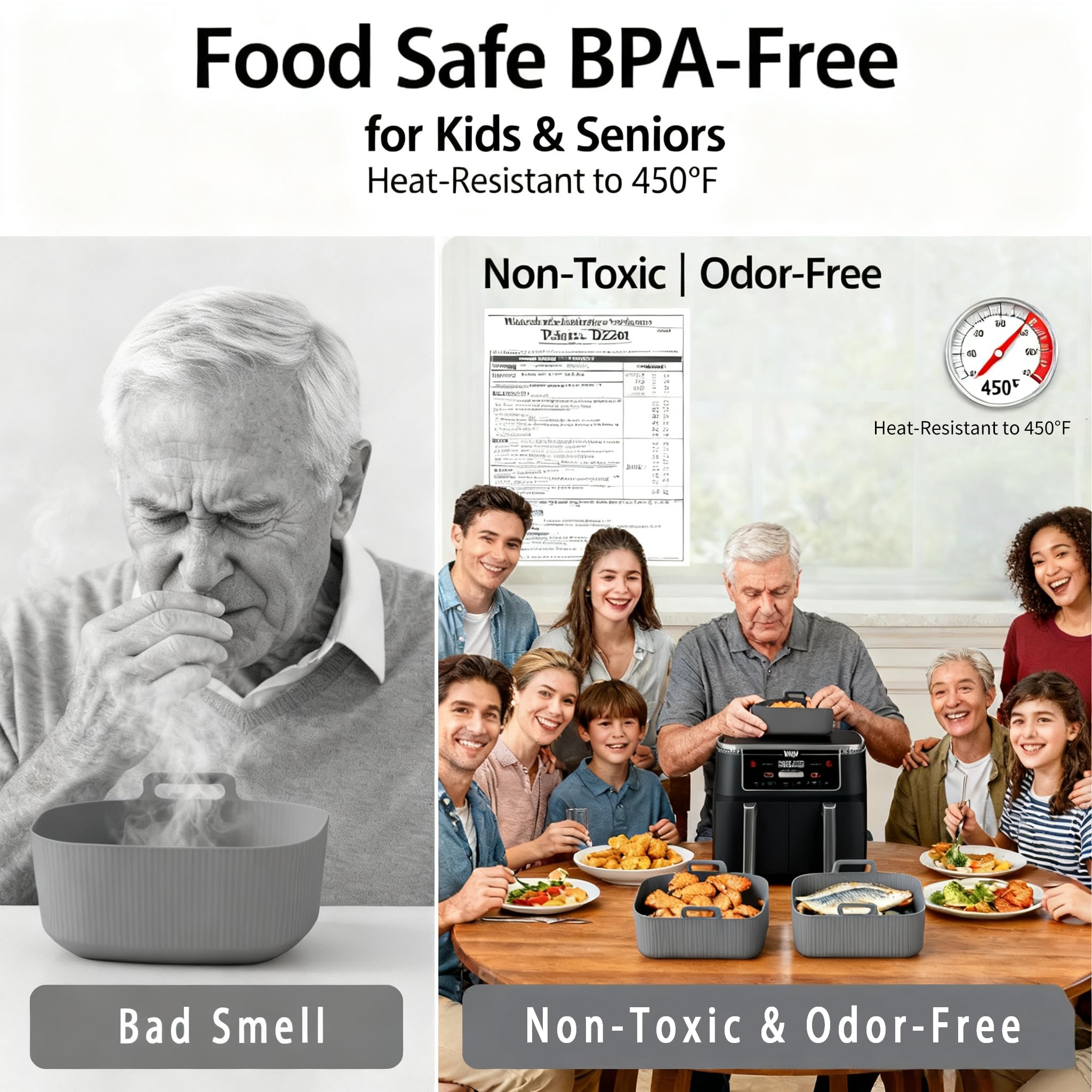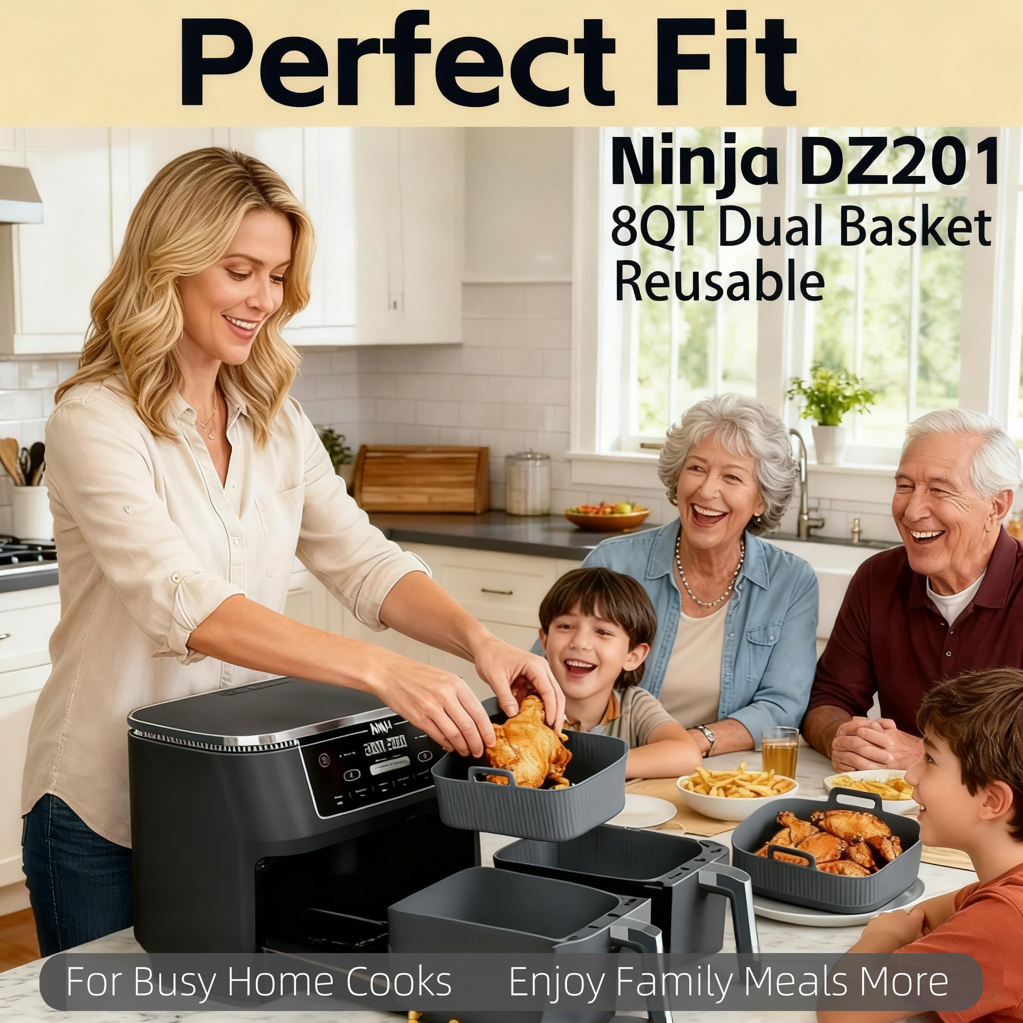 Non-Stick & Easy Clean: These 8QT food-grade reusable rectangular silicone air fryer liners for the Ninja DZ201 dual basket 2-pack are dishwasher-safe, eliminating scrubbing and stuck-on grease. They save cleaning time by 51%, perfect for busy home cooks enjoy family meals more,whether cooking juicy chicken, crispy fries, or delicate fish.