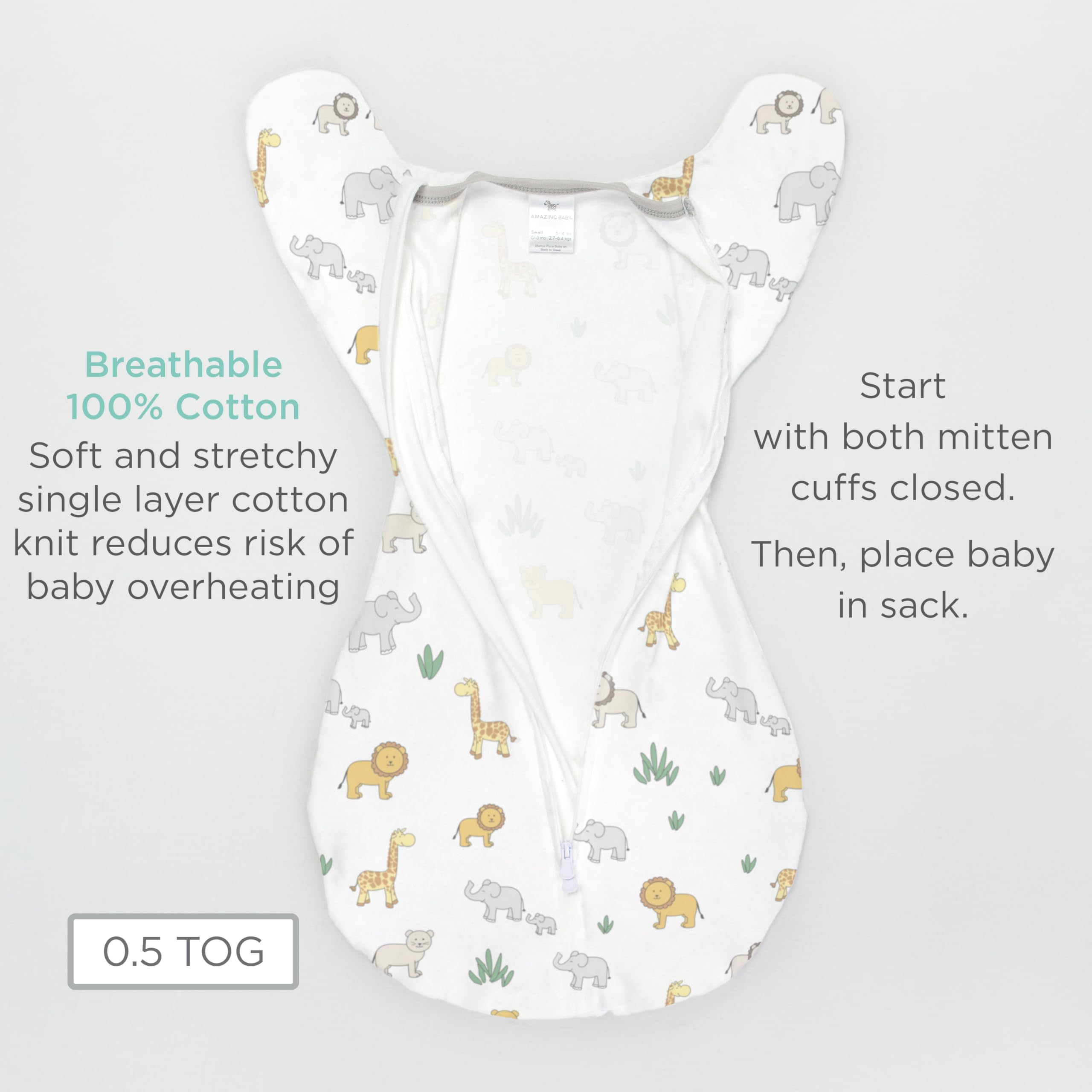 The Transitional Swaddle Sack is the easiest & safest way to transition baby from a traditional swaddle. The arms up sleeve design allows baby to self-soothe and the unique ½-length sleeves with foldover mitten cuffs closed provide partial suppression of the Startle Reflex to promote better sleep; and, if baby rolls over during sleep, the sleeves allow baby to use arms to lift torso and head to access air to promote safer sleep. The Transitional Swaddle Sack is ideal for babies who prefer to sleep with arms up, babies who are starting to rollover, and babies who break out of a traditional swaddle. The uniquely-shaped, ½-length sleeves are not full length, so when mitten cuffs are closed, baby’s arms will be flexed close to body for swaddle snugness. The foldover mitten cuffs may be worn open or closed. Caregiver can open one or both cuffs, so baby can self-soothe by sucking directly on hand. Helpful 2-way zipper with 2 zipper pulls. The zipper zips down from the top to make it easy to place baby in the sack and zips up from the bottom to make it easy to change baby’s diaper. Designed by a nurse. 100% Cotton. Soft, stretchy cotton knit. 0.7 TOG. Machine wash warm and tumble dry low. US patents 11,812,795 & D833,613 with patents in EU, UK, CA, CN, JP and other countries.
