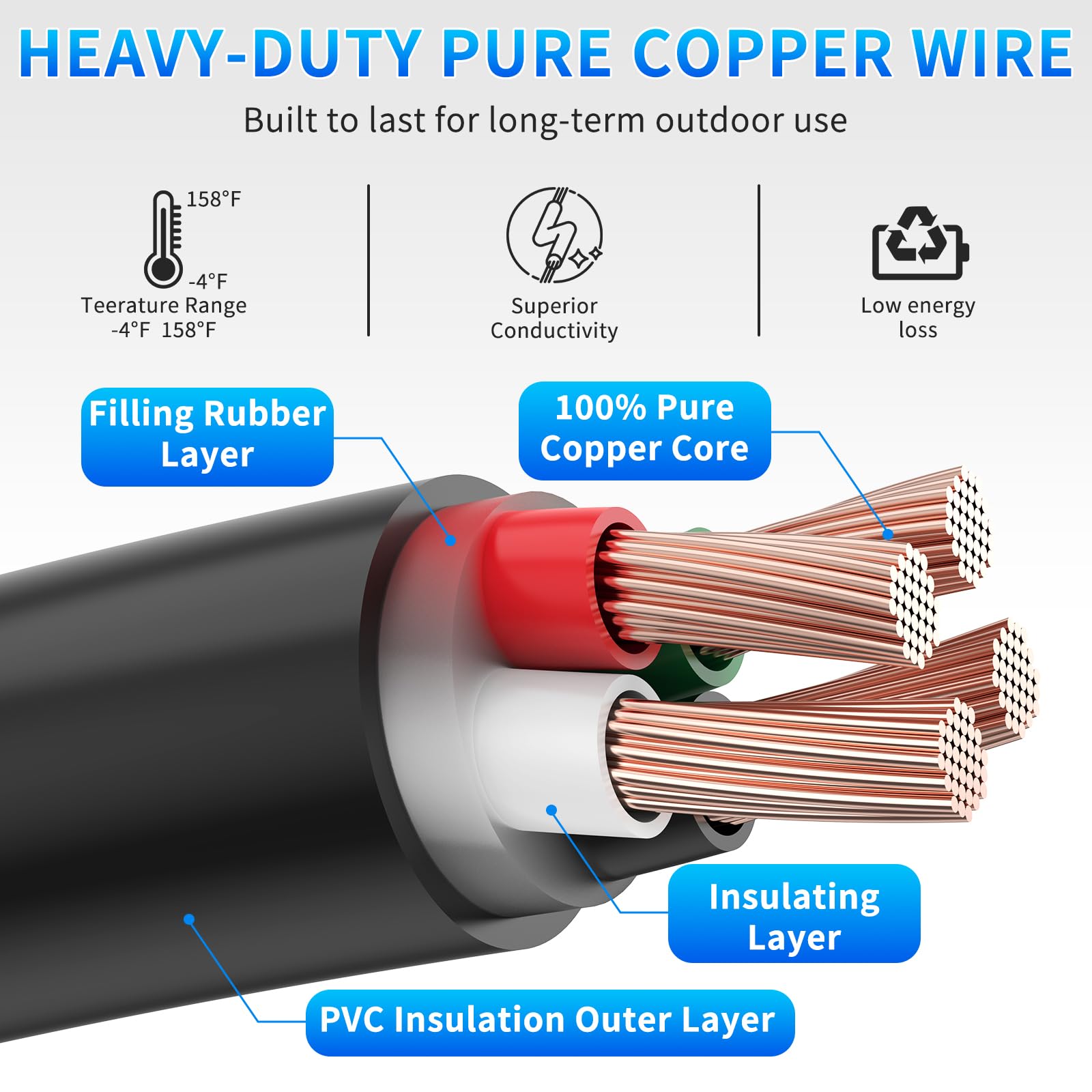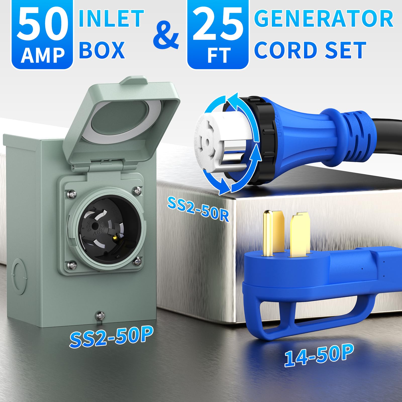 【Heavy-Duty Power Cord】50 Amp Generator Power Cord: 25 Feet, heavy-duty NEMA 14-50P to SS 2-50R, Made of 100% copper wiring, it is corrosion-resistant, wear-resistant, and short-circuit proof. Threaded ring design adapter plug for the generator to the house. Providing a stronger connection and creating a weatherproof connection, ensuring further moisture protection during outdoor use.