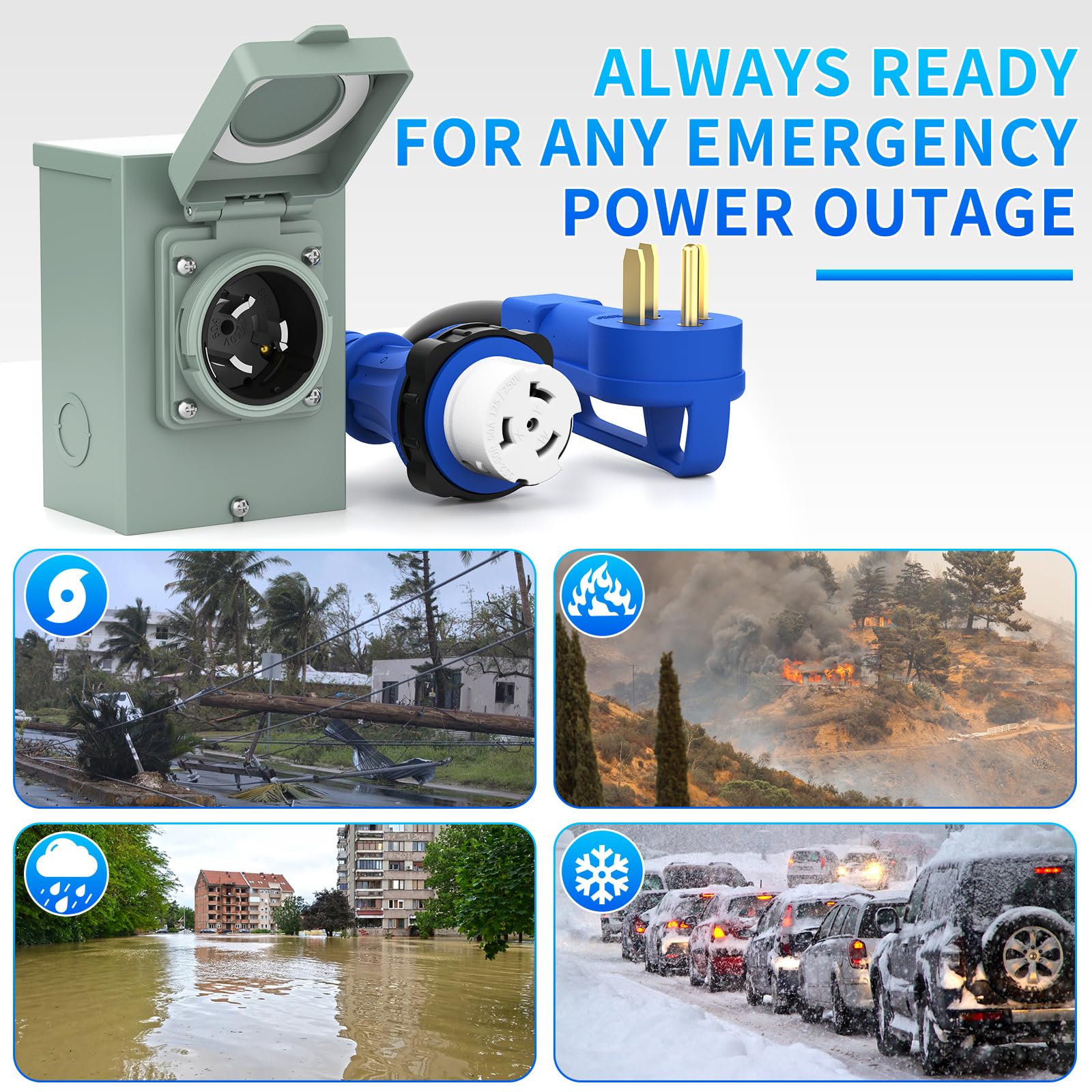 【ETL Listed】50 Amp, 125/250V, 7500W Power Inlet Box, equipped with SS2-50P male configuration, for use with all generators up to 7,500 Running Watt. Maximum support for 10 AWG wires. When insufficient power and bad weather such as tornadoes and blizzards, power inlet box continuous backup power can be provided and maintained from the generator outside.