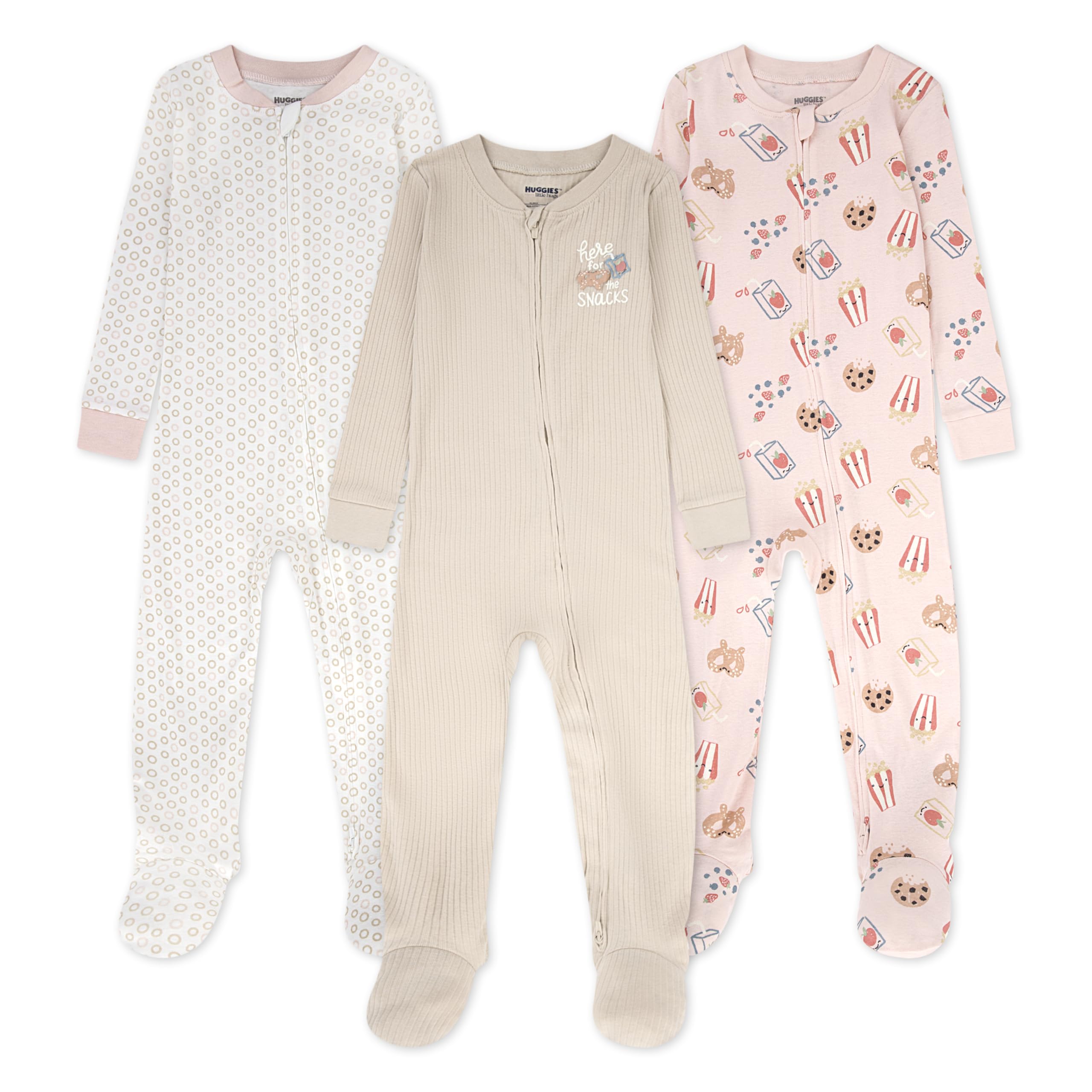Description Designed by the baby experts at Huggies, this 3-pack of sleep coveralls are made of skin-healthy organic cotton rib knit fabric that feels soft and gentle on your child's precious skin. The full-zip closure makes late-night diaper changes a breeze, elasticized, footed bottoms keep tiny toes warm all night, and silicone grips give your toddler an extra boost when they are on the move. With three adorable prints to choose from, this 3-pack wraps your little one in comfort and cuteness!
