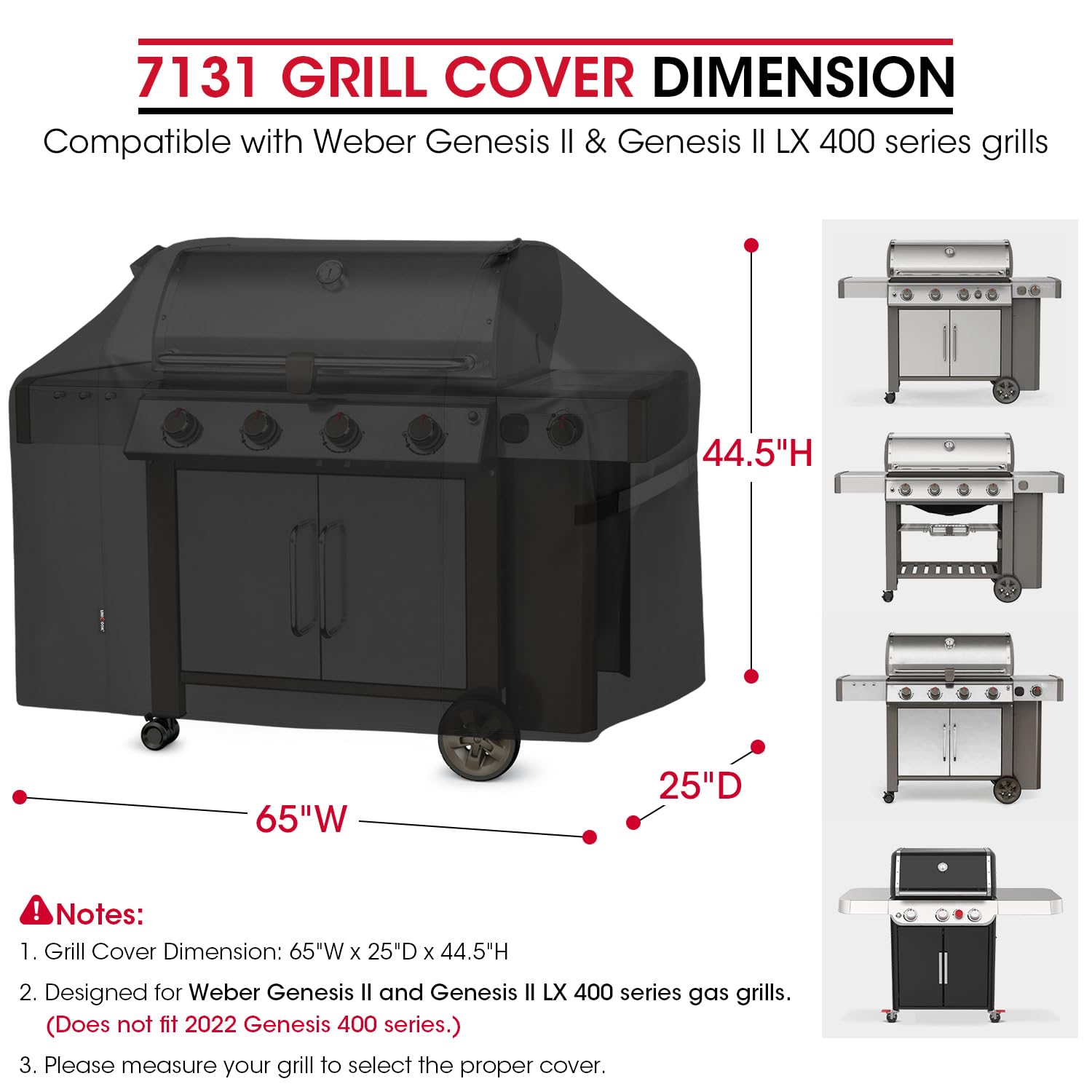 Grill Cover 65 Inch Dimension: Measures 65"W x 25"D x 44.5"H, Same dimension with Weber 7131 grill cover, compatible with Weber any 4 burner grills, Genesis II and Genesis II LX 400 series (Does not fit 2022 Genesis 400 series). Also works for other 3 - 5 burners grills with similar sizes up to 63"W, such as Char-Broil, Nexgrill, Napoleon, Broil King and more