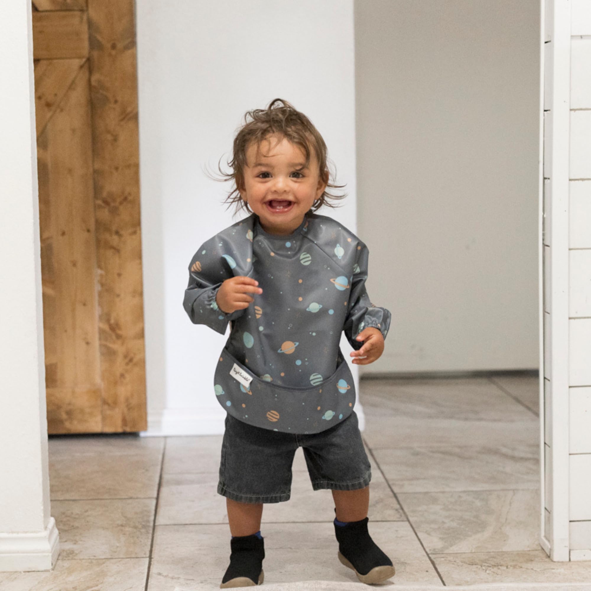 FLEXIBLE COMFORT: Our lightweight bib with sleeves moves with your child, ensuring a soft, non-restrictive fit for every activity. Perfect as a baby food bib for mealtime, playtime, and on-the-go adventures.