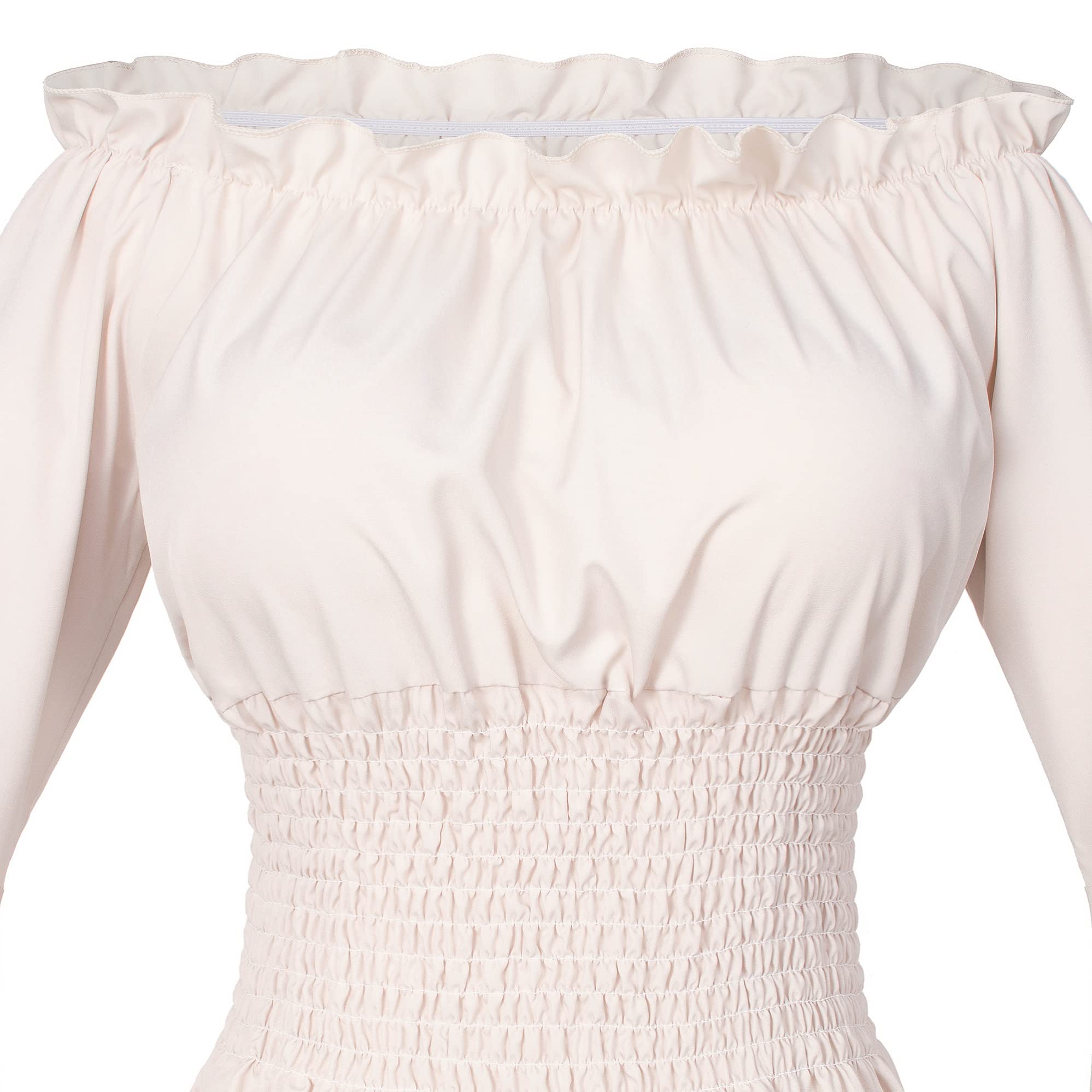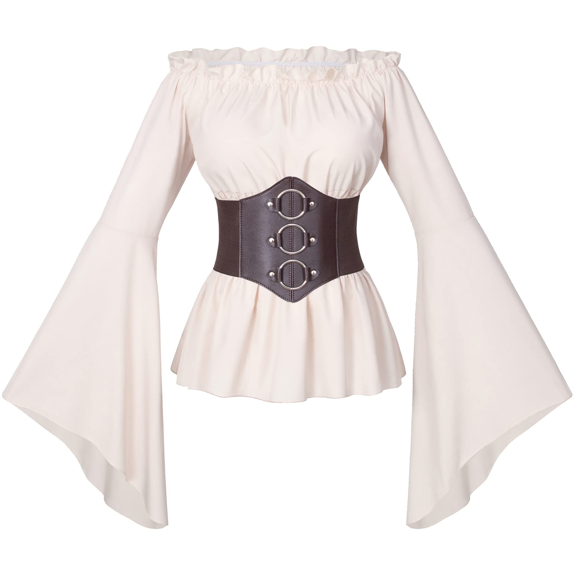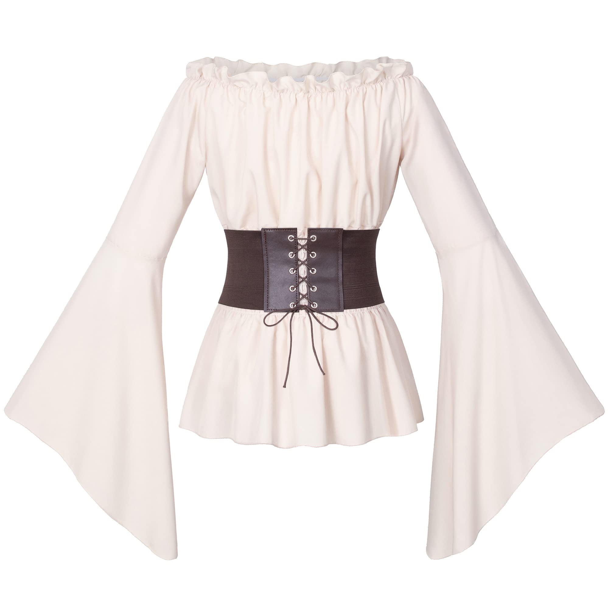 Material: 97%polyester 3%spandex,well made, soft and comfortable to wear, renaissance sexy off shoulder top blouse shirt.The PU leather belt is fastened with a drawstring to fit your waist better.