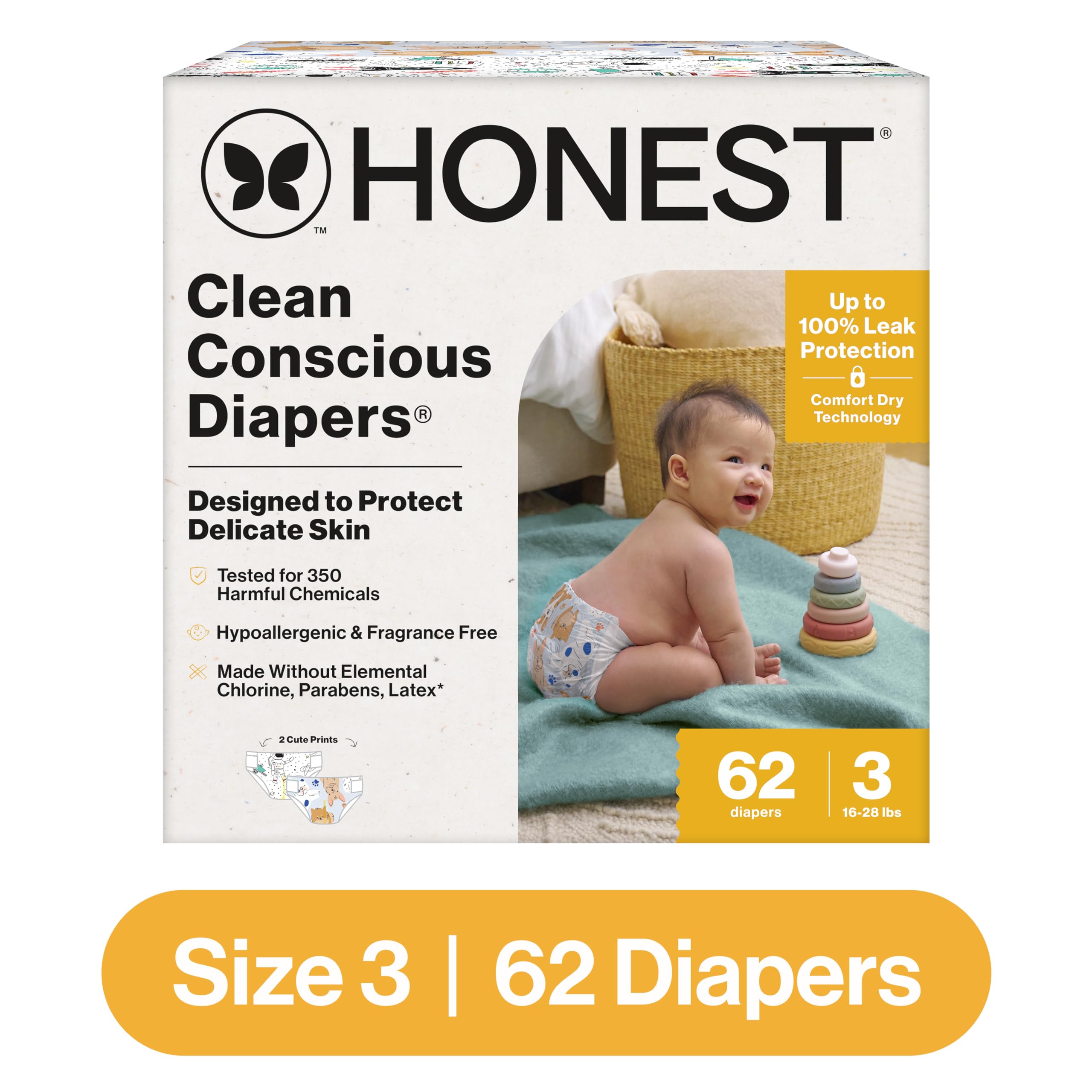 Designed to protect delicate skin, Honest Clean Conscious Diapers keep baby comfortable and dry through all the wiggles and wobbles! Our softest diaper yet delivers up to 100% leak protection with Comfort Dry Technology. The hypoallergenic, plant based inner liner, flexible stretch wings, super absorbent core, and channel technology provide a comfy, secure fit for all ages and stages. Because safety is top priority, these diapers are OEKO-TEX STANDARD 100 Certified, a 3rd party that tests for 350 harmful chemicals, and made with FSC Certified Fluff Pulp and other controlled materials. And for cuteness overload, each diaper features a super cute print!