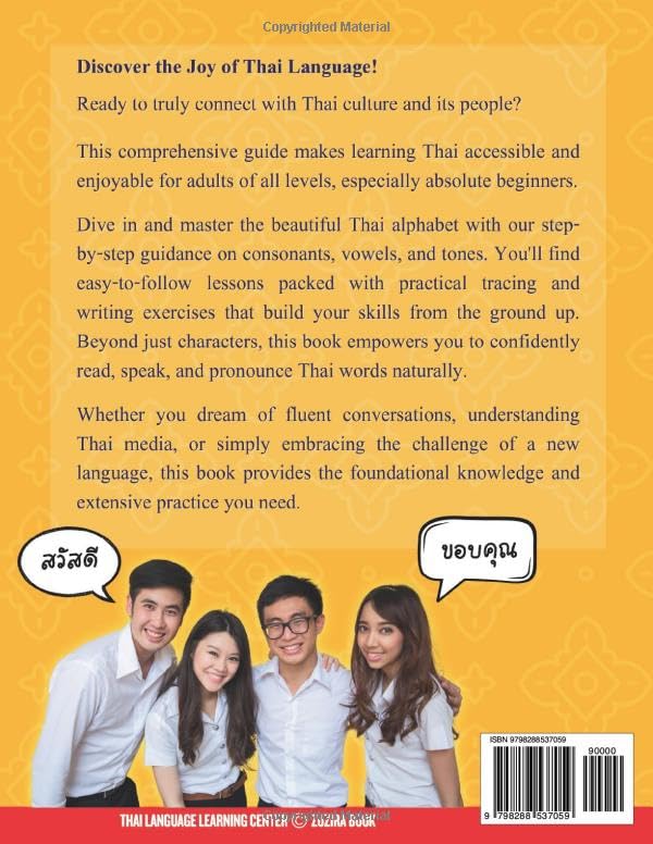 Unlock the Secrets of the Thai Alphabet: Your Complete Workbook for Adults! Are you ready to finally master the beautiful and unique Thai script? Whether you're planning an exciting trip to Thailand, connecting with Thai friends, or simply seeking the rewarding challenge of learning a new language, "Thai Language Workbook for Adults: The Complete Guide to the Thai Alphabet" is your essential companion. Designed specifically for absolute beginners, this comprehensive guide provides everything you need to confidently read, write, and pronounce Thai words. Forget overwhelming textbooks – our easy-to-follow lessons break down the complexities, making learning accessible and enjoyable. Inside this indispensable Thai language workbook, you'll discover: Step-by-step mastery of the Thai Alphabet: Learn all consonants, vowels, and their unique forms with clear explanations. Extensive Tracing & Writing Practice: Develop perfect handwriting with dedicated practice pages for every character and sound. Demystifying Thai Pronunciation: Understand vowel usage, consonant classes, and essential tone rules to speak Thai accurately. Practical Exercises & Drills: Reinforce your learning with engaging activities designed to build strong foundational skills. From Zero to Confidence: Progress from recognizing individual letters to reading and forming basic Thai words with ease. This book focuses on building a solid foundation in the Thai script, empowering you to unlock further language learning. Stop wishing you could read Thai and start doing it today! Begin your exciting journey to mastering the Thai alphabet. Scroll up and grab your copy now!