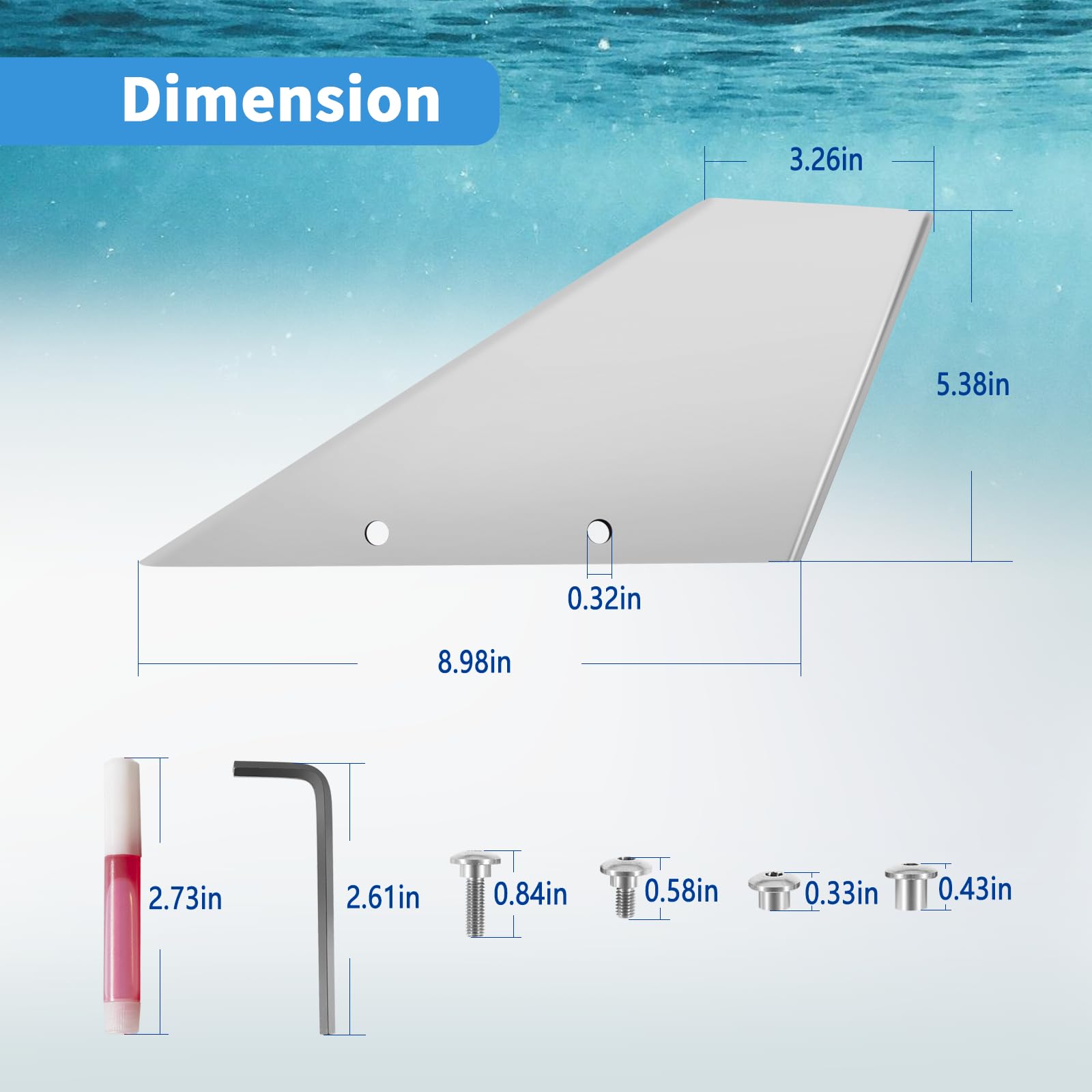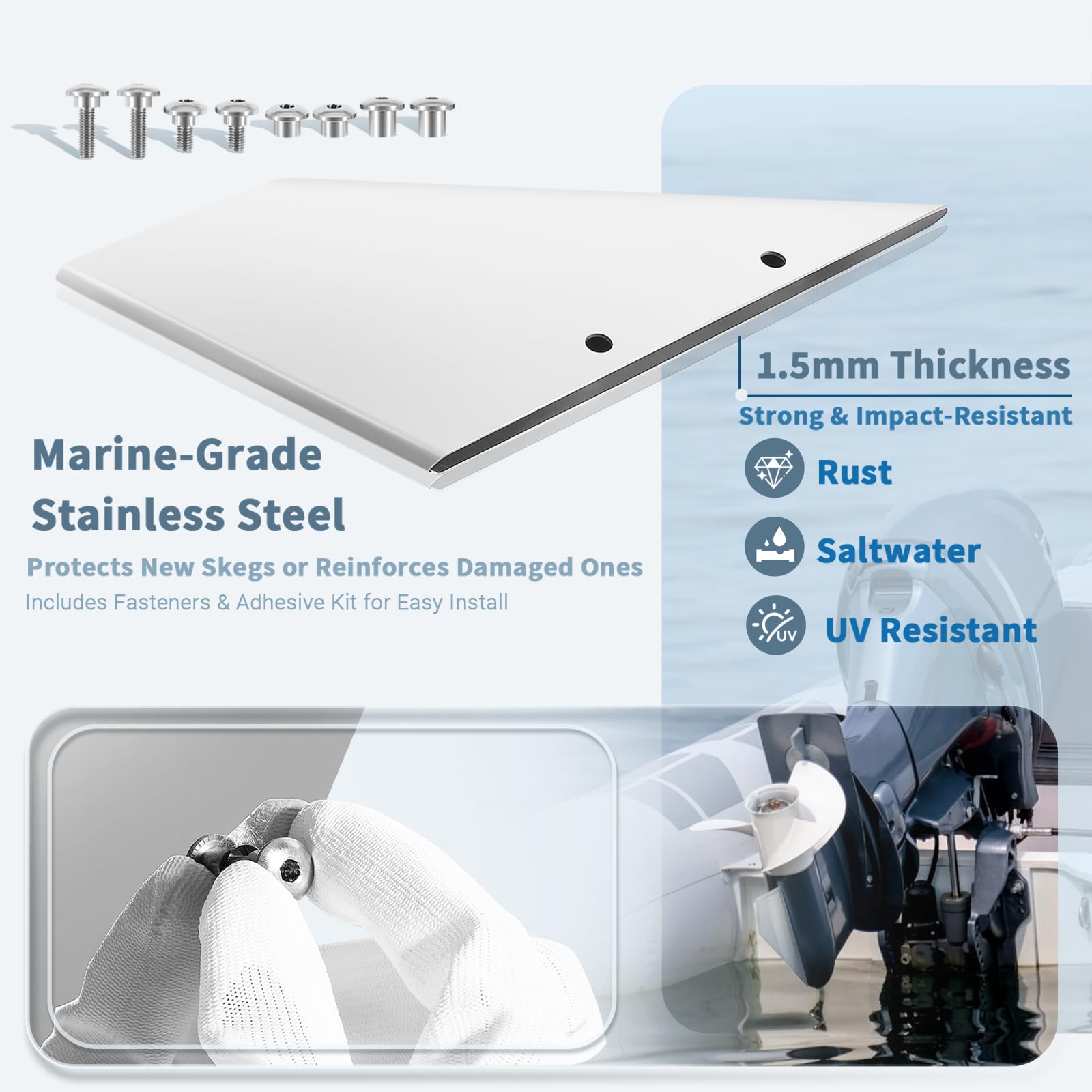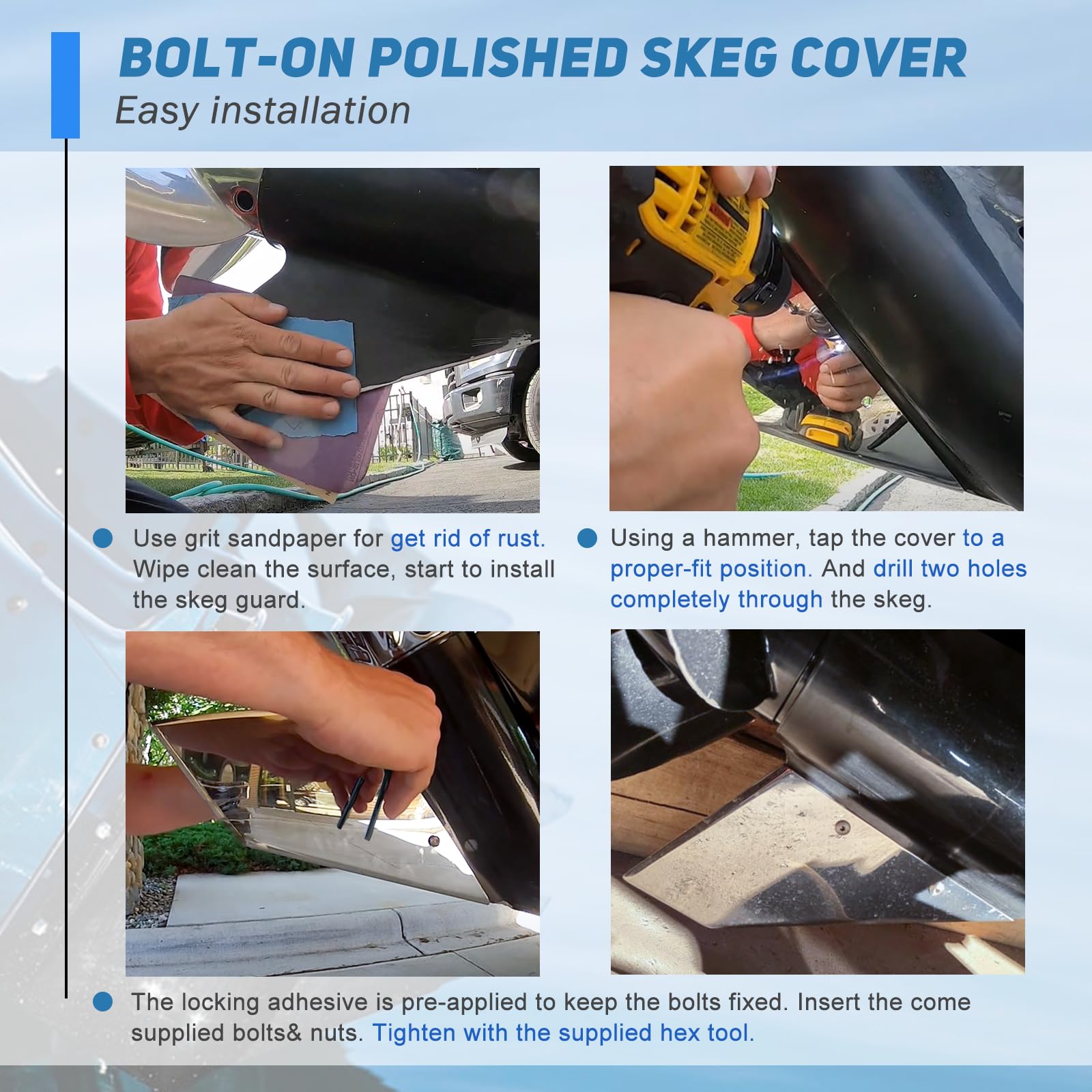 【Easy Operation】35-SS625 skeg protector guard package includes skeg mounting hardware, an allen wrench, and thread-locking adhesive. You only need conventional hammers and air drills, drill holes, tap the skeg guard into the right place, secure the bolts, and finish the installation.