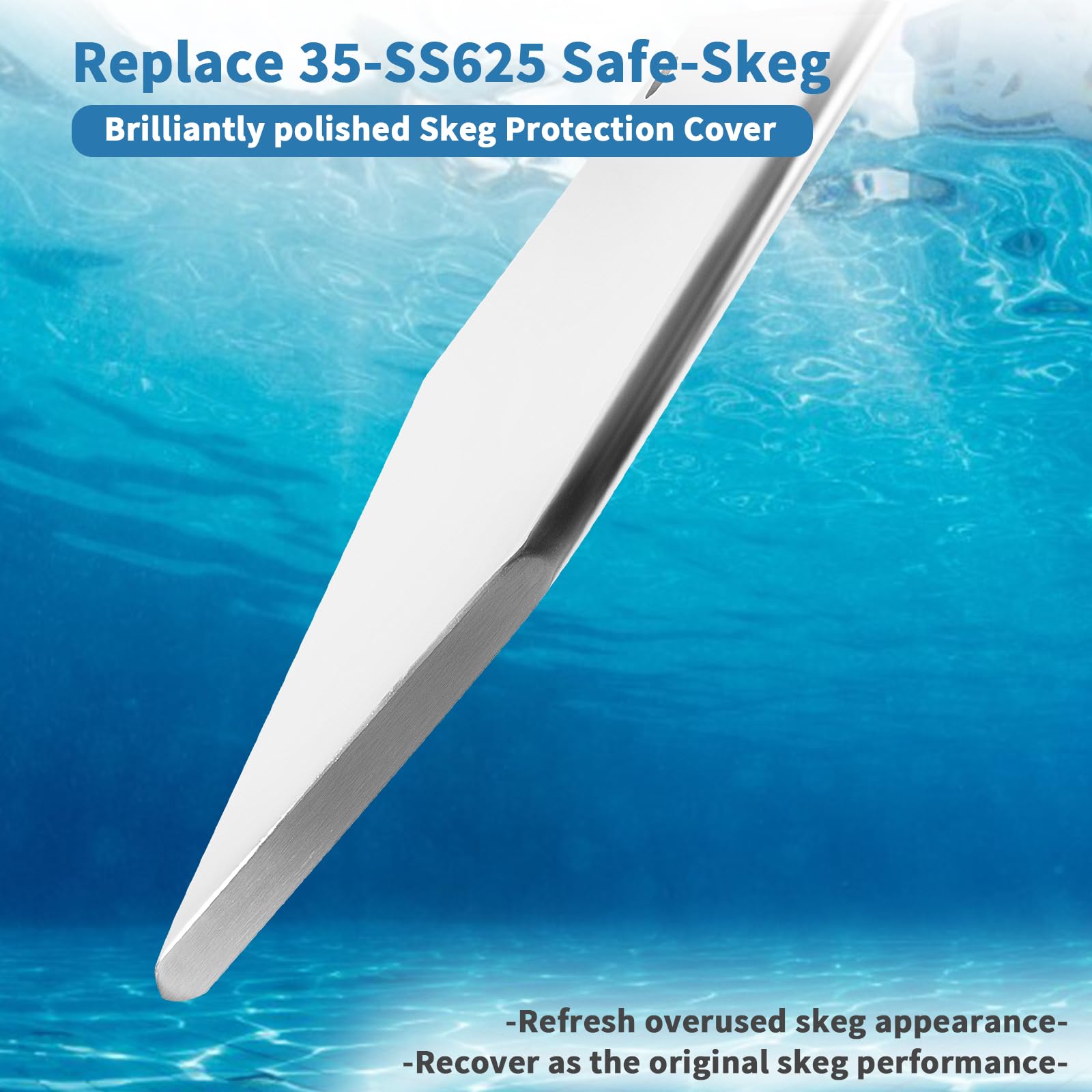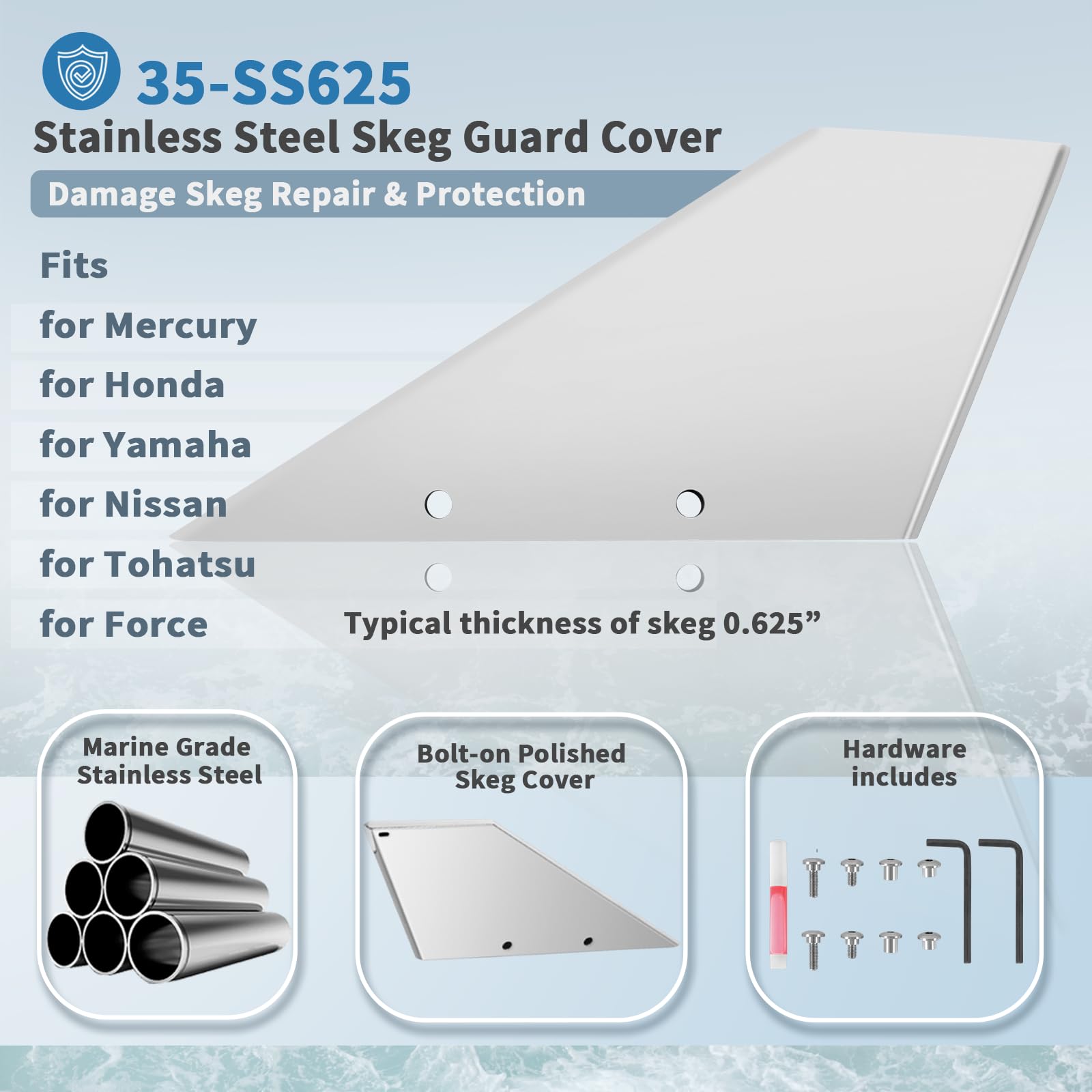 【Restore Damage Skeg】35-SS625 safe-skeg is a bolt-on steel cover that attaches to the existing damaged skeg to restore the original skeg performance, handling, and appearance. Hassle-free retrofit repair solution for your damaged skeg, worked with our stainless steel skeg protector guard.