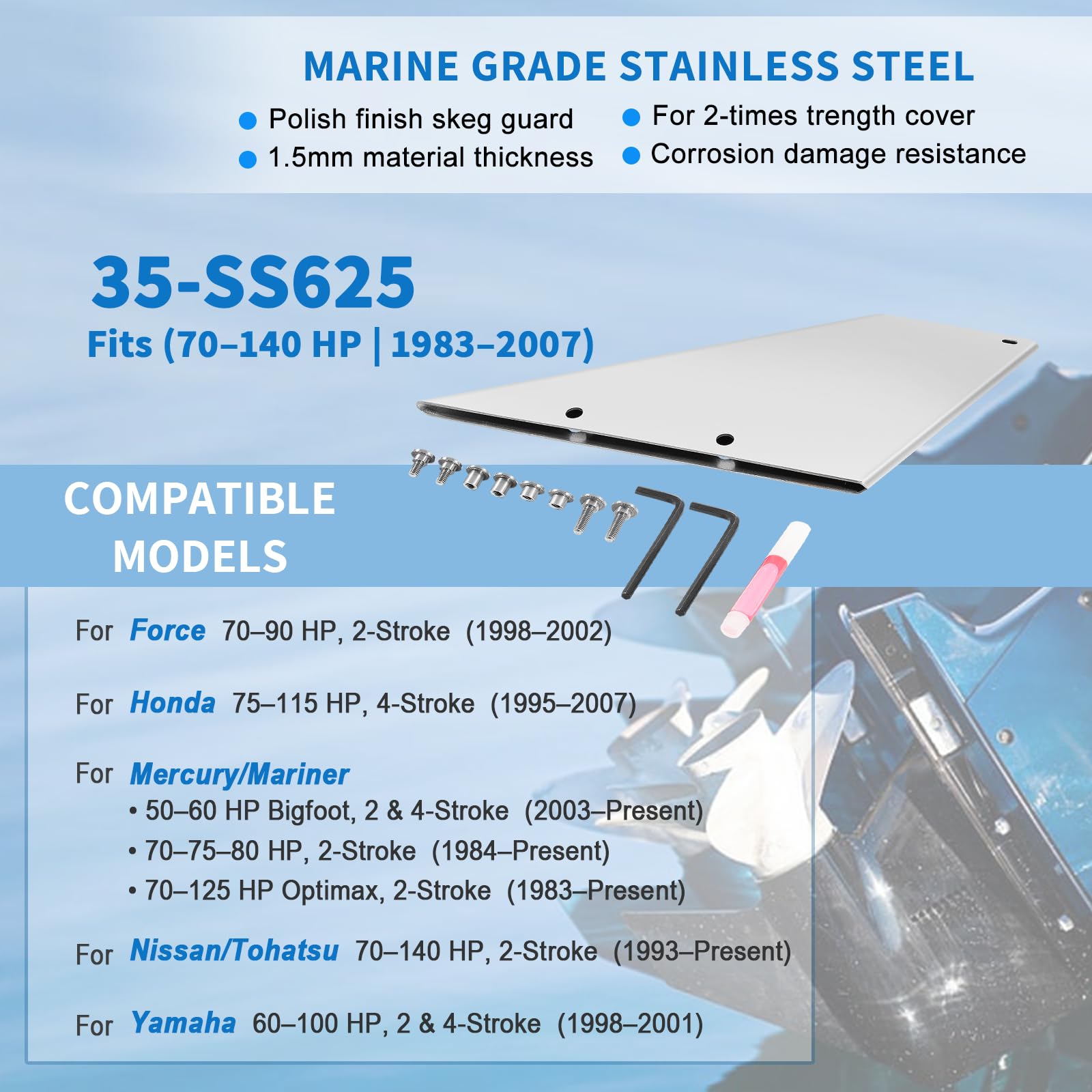 35-SS625 Skeg Guard Skeg Protector Cover for Mercury, Honda, Yamaha, Nissan, Tohatsu, and Force Outboard Lower Unit Skeg Repair Kit