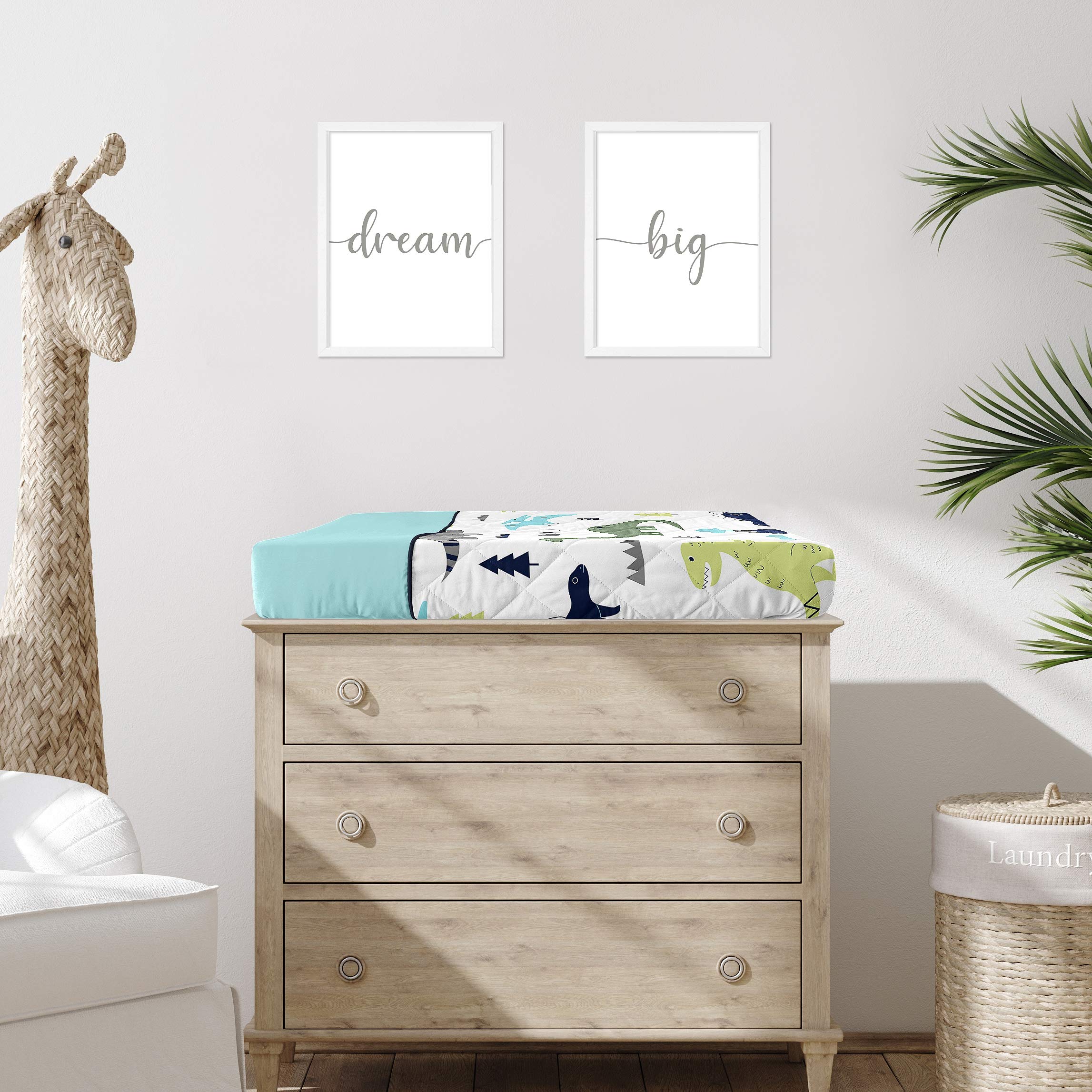 This brushed microfiber diaper pad cover features an exclusive design of a turquoise blue and dark green modern boho mod dinosaurs.