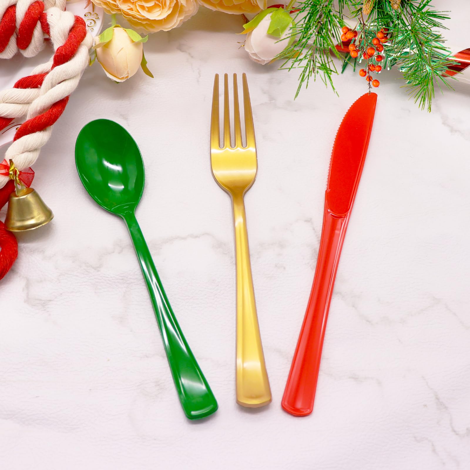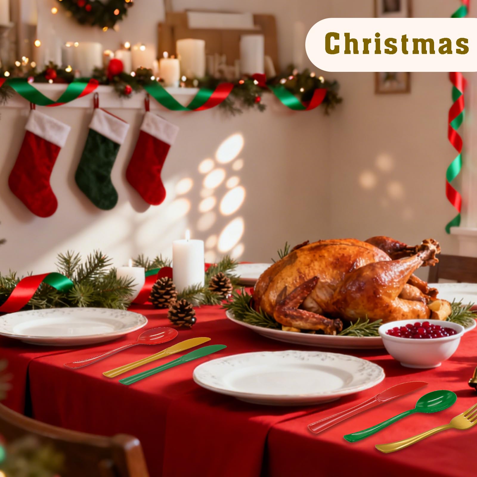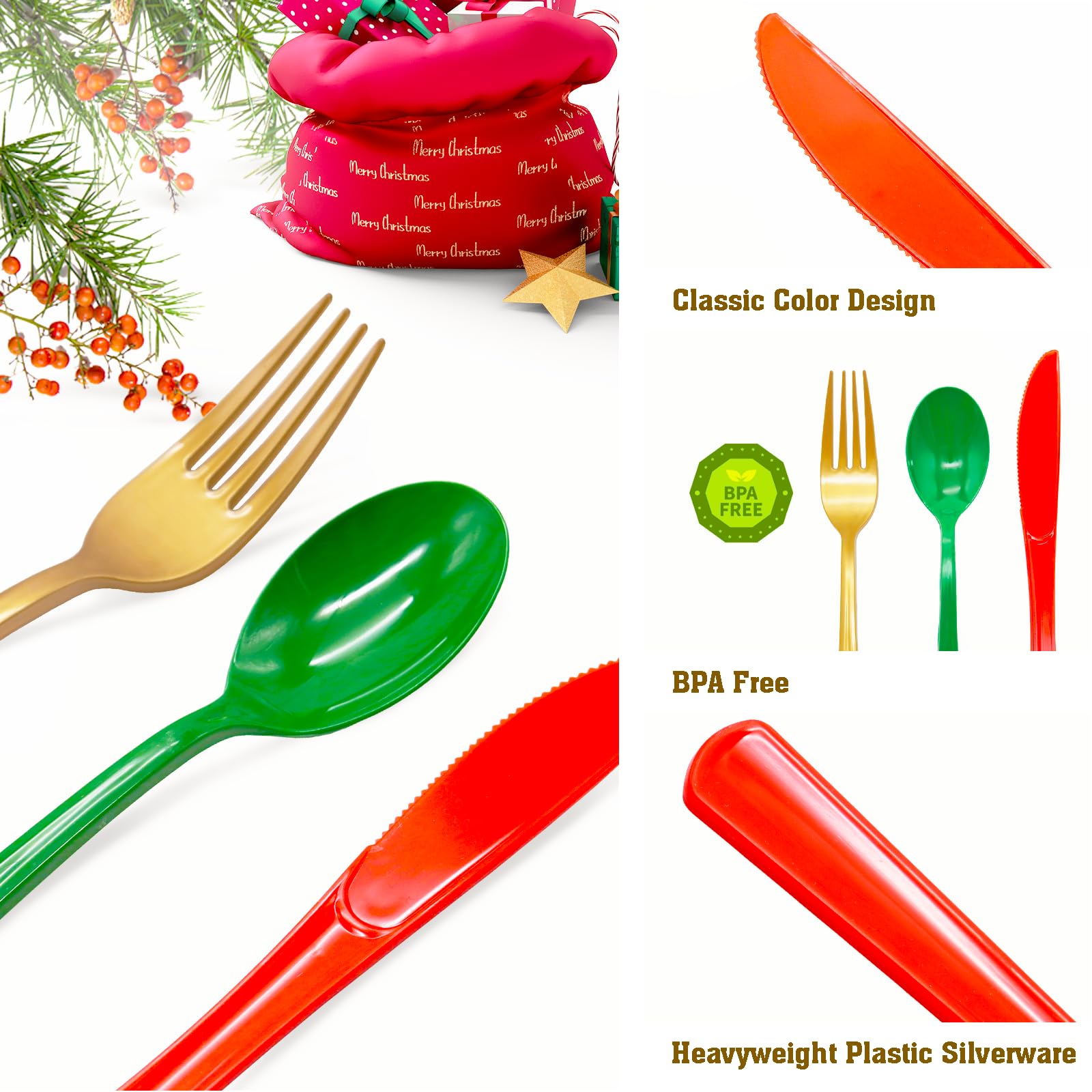 【Classic Color Combination】: Christmas plastic silverware set adopts three classic Christmas colors of red, green and gold, which perfectly fits the festive atmosphere. Not only practical but also decorative, add beauty to your table and create a festive feeling for Christmas party.