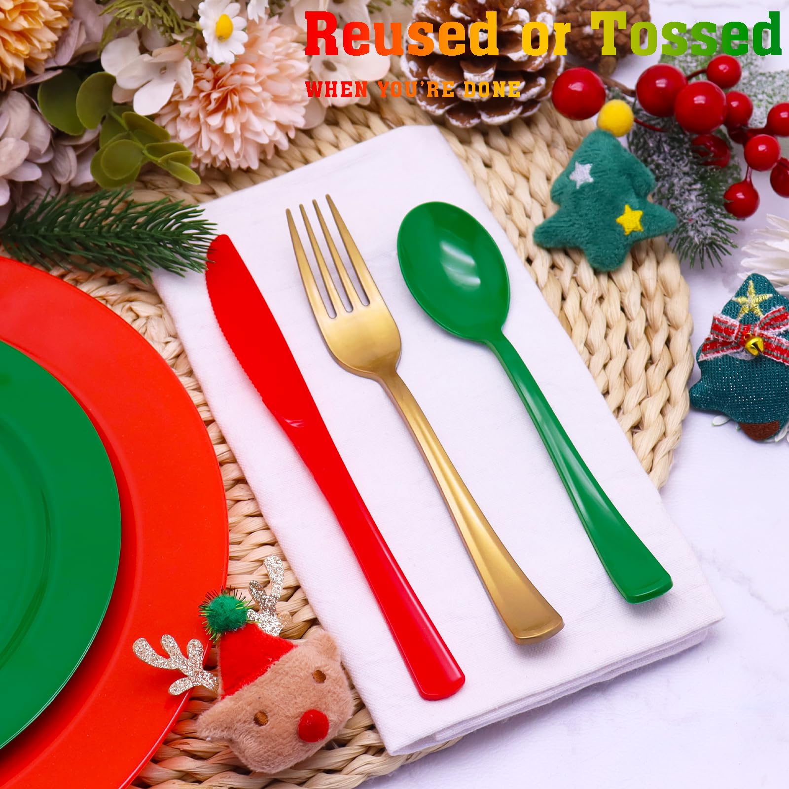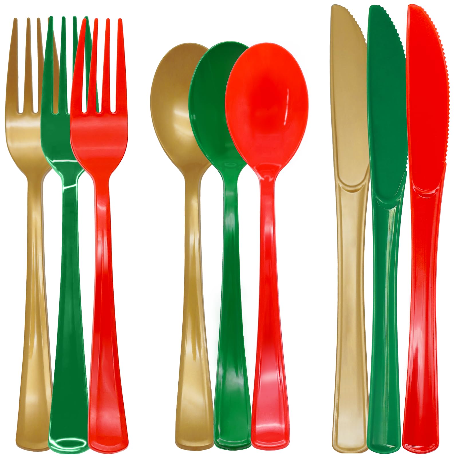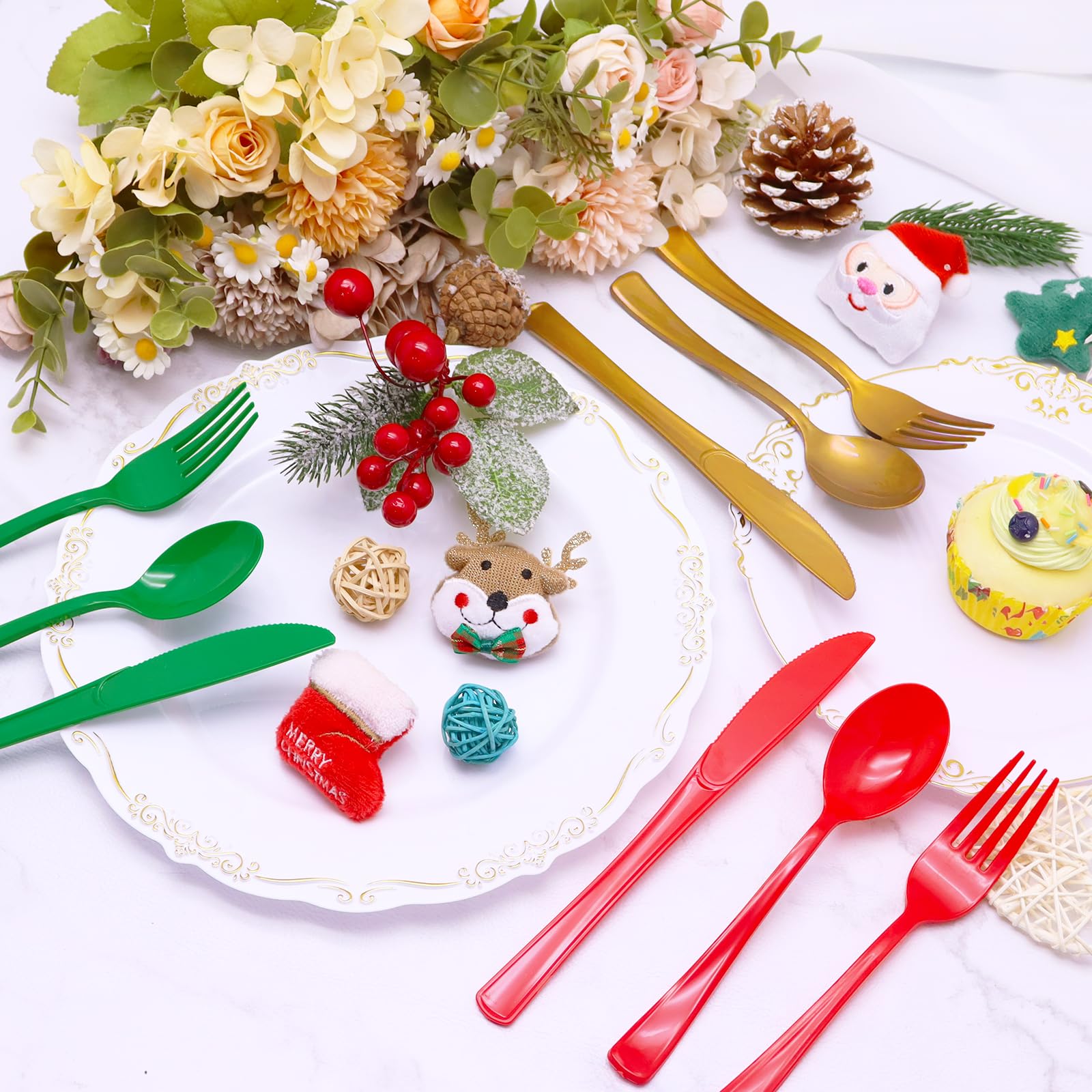 【Classic Color Combination】: Christmas plastic silverware set adopts three classic Christmas colors of red, green and gold, which perfectly fits the festive atmosphere. Not only practical but also decorative, add beauty to your table and create a festive feeling for Christmas party.