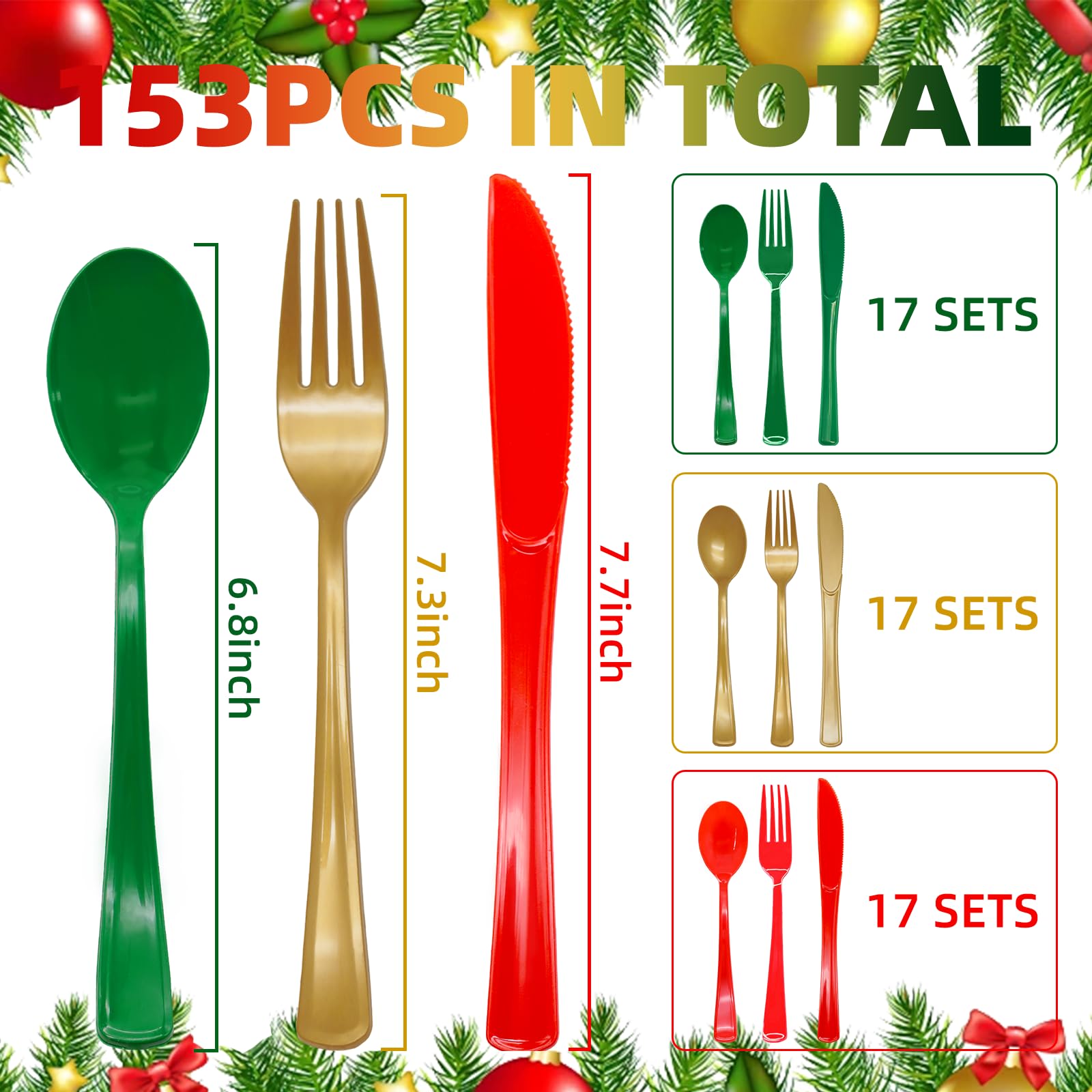 【Hight Cost-Effective】:This set of Christmas cutlery sets includes 17 sets red plastic silverware, 17 sets green plastic silverware, 17 sets gold plastic silverware, can serves 51 guests at the same time. Sufficient quantity and perfect match for your Christmas party needs.