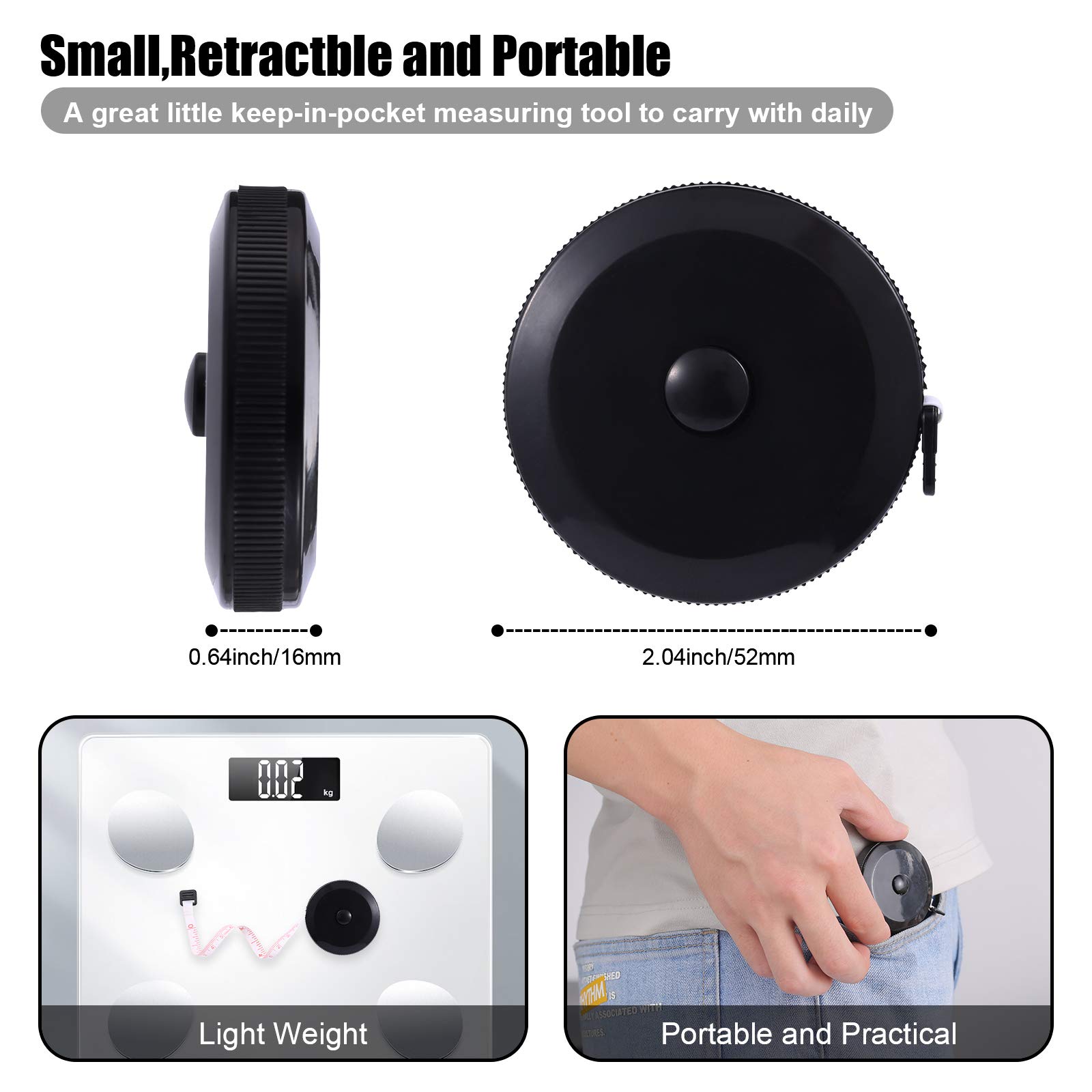 【Portable, Easy to Carry & Storage】- You can put it in purse or pocket, the plastic tape is small and won’t occupy any space. It can be used to measure clothes, your height, check up the waistline when you on a diet, record the head circumference of babies, your body measures etc.