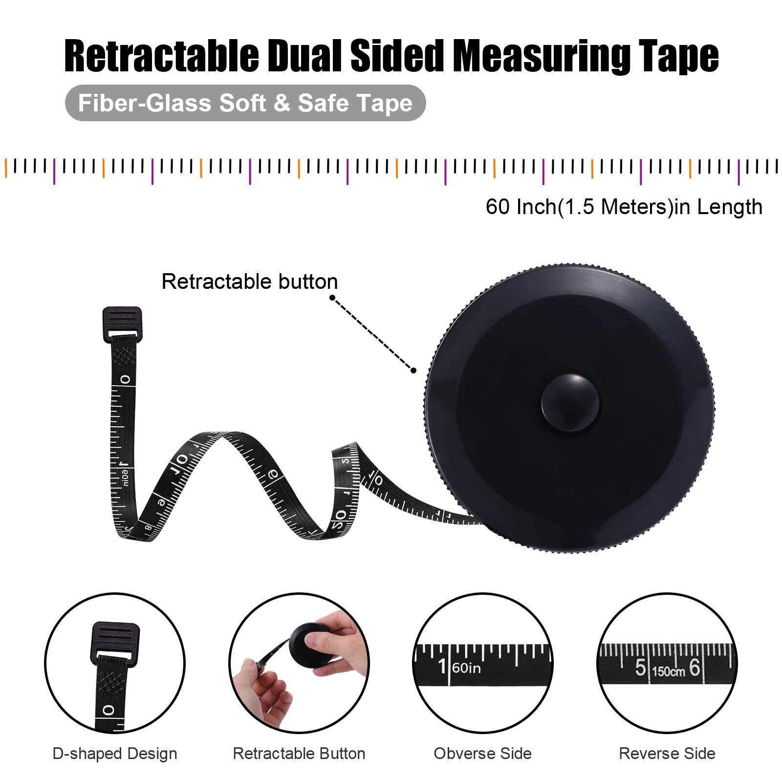 【Non-Stretch Durable Material】- The measuring tape is made of non-stretch fiberglass material, which is durable and wear resistant. With a portable handy plastic case outside, the inside flexible vinyl tape measure is 1.5M/60In in length, which totally meet your requirements for measure stuff.