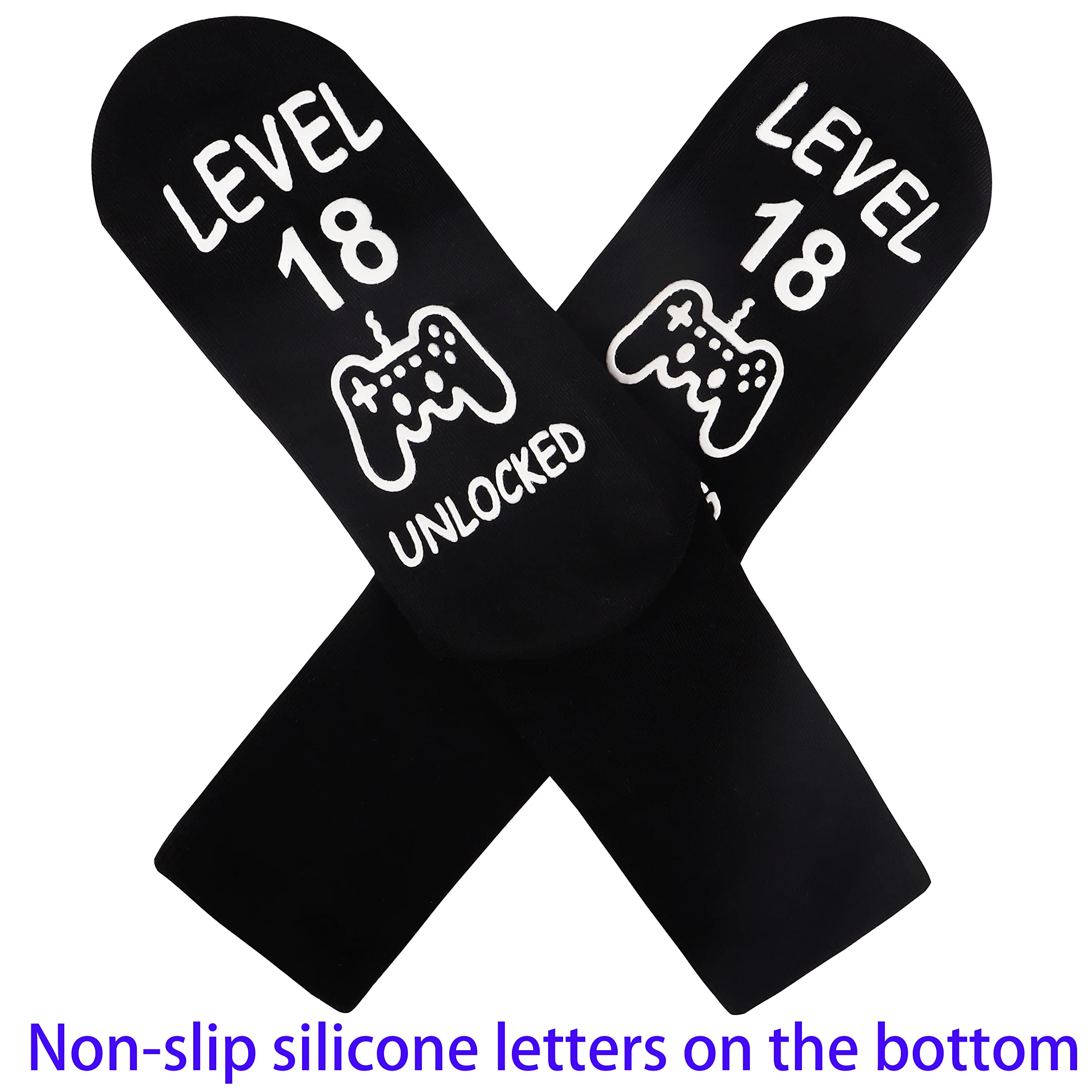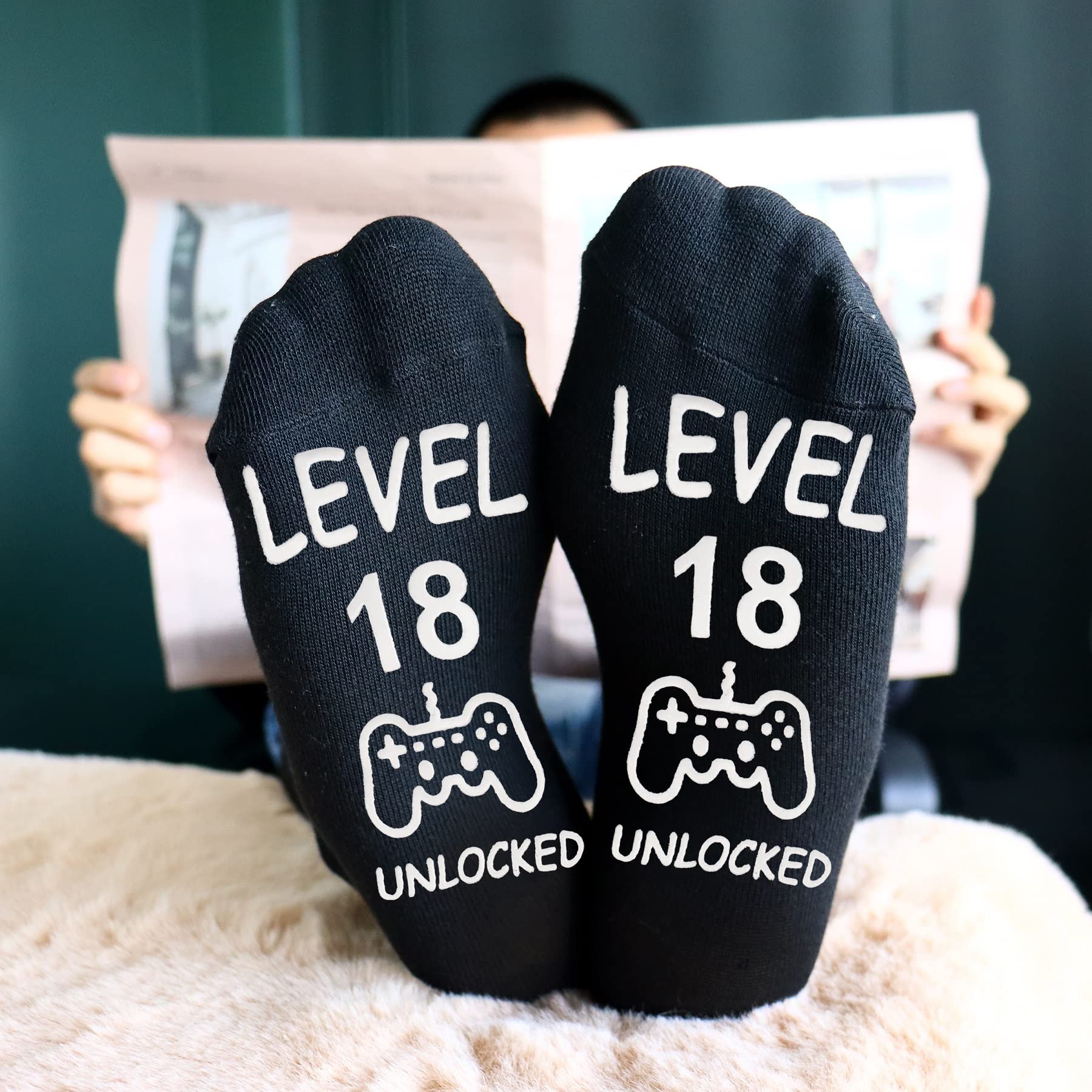 Funny Design: “LEVEL 18 UNLOCKED ” with game-pad printed on these black crew socks. Put on these fun socks, your boys would have a great day.