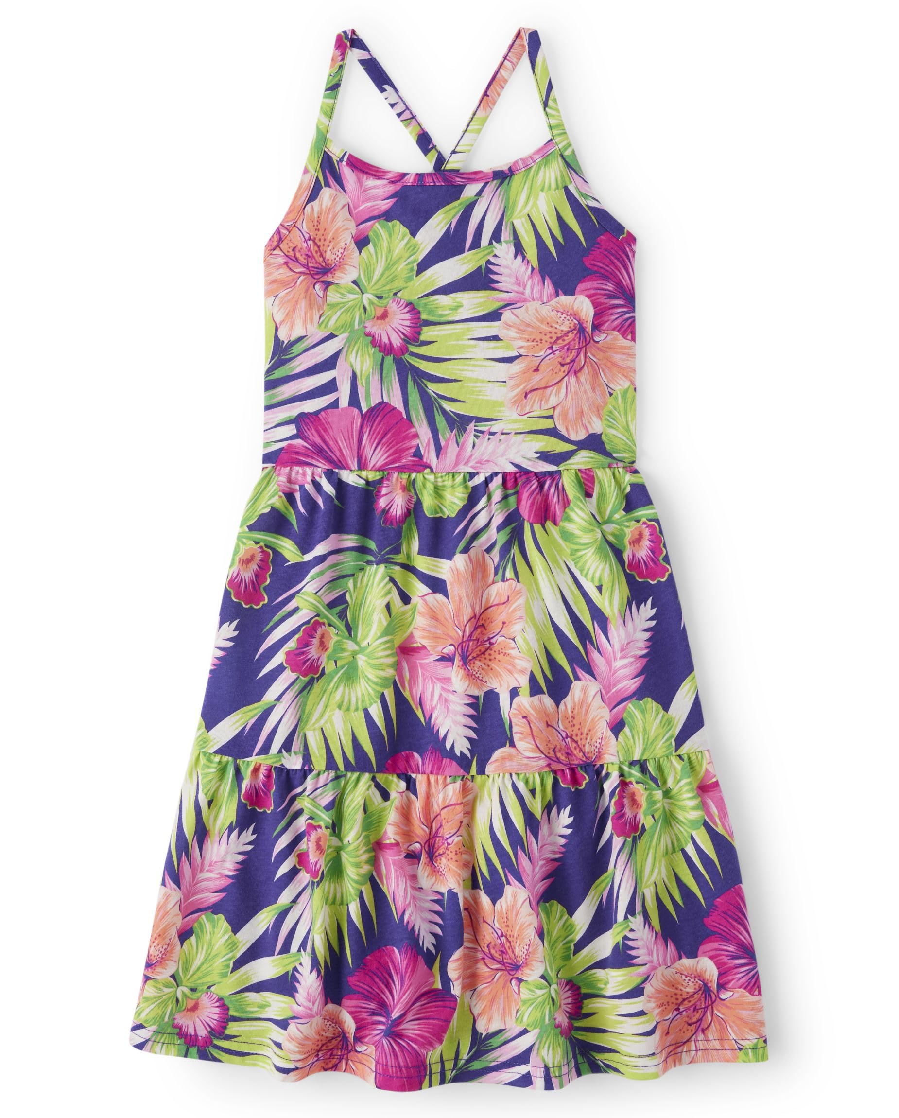 DESIGN — Features short flutter sleeves, off shoulder neck, tiered body, above-the-knee length and allover tropical floral print