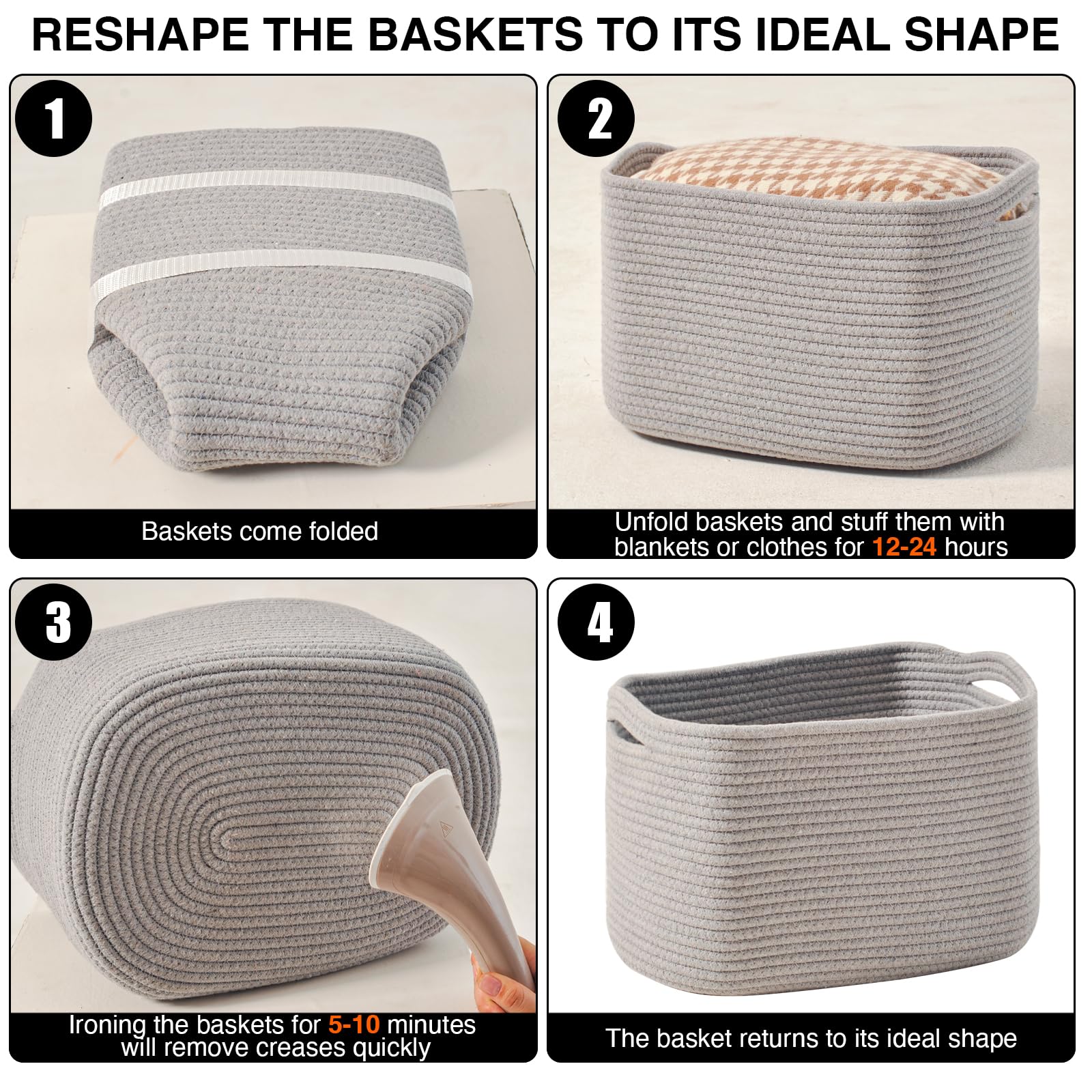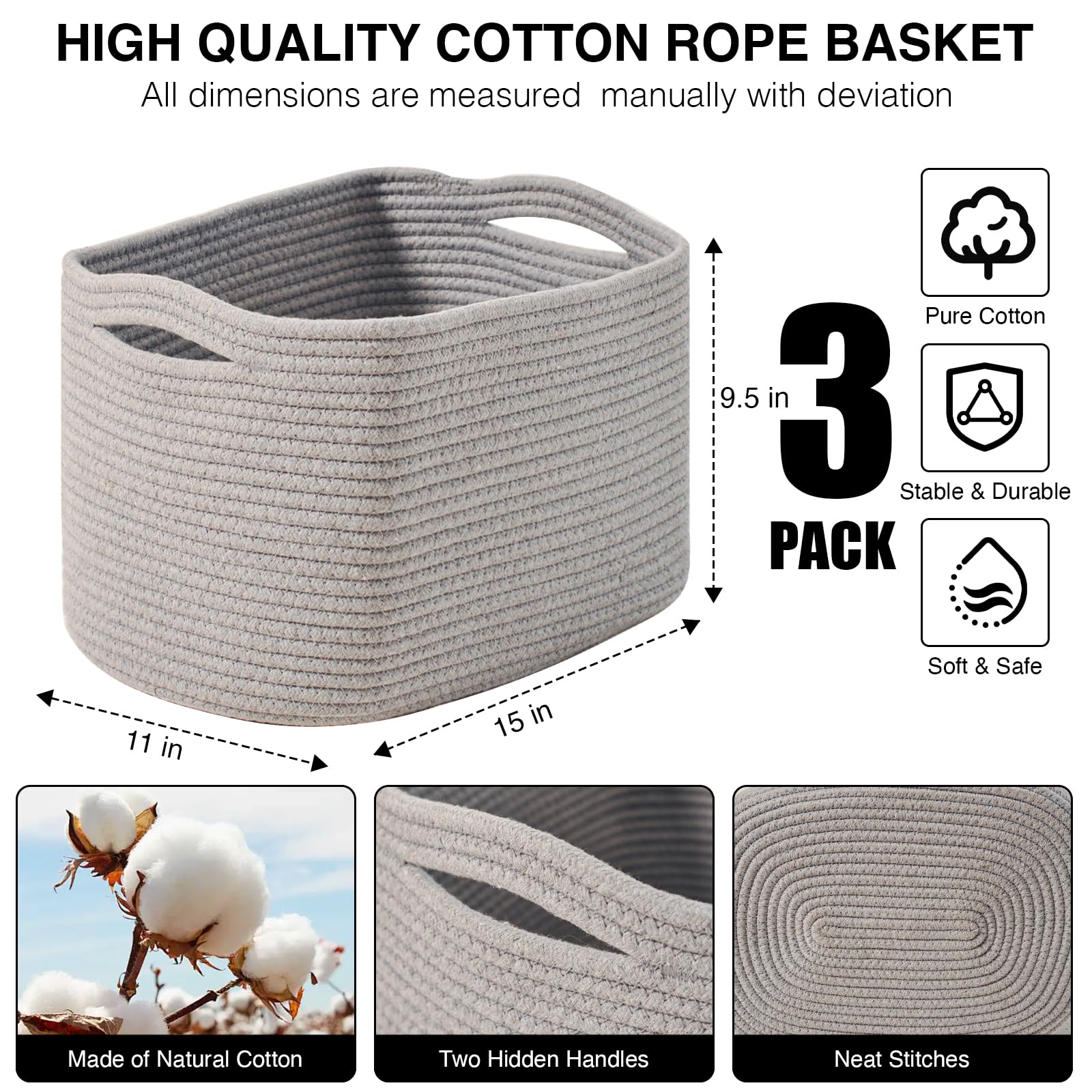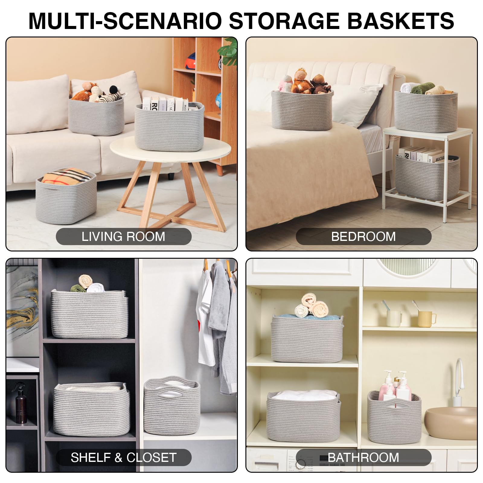 Multi-functional Design: These 15"x11"x9.5" gray baskets are the perfect solution to tackle everyday clutter. Our woven baskets for storage accommodate various items such as clothes, toys, books, Towels, and cosmetics, helping you maintain a tidy and organized living space