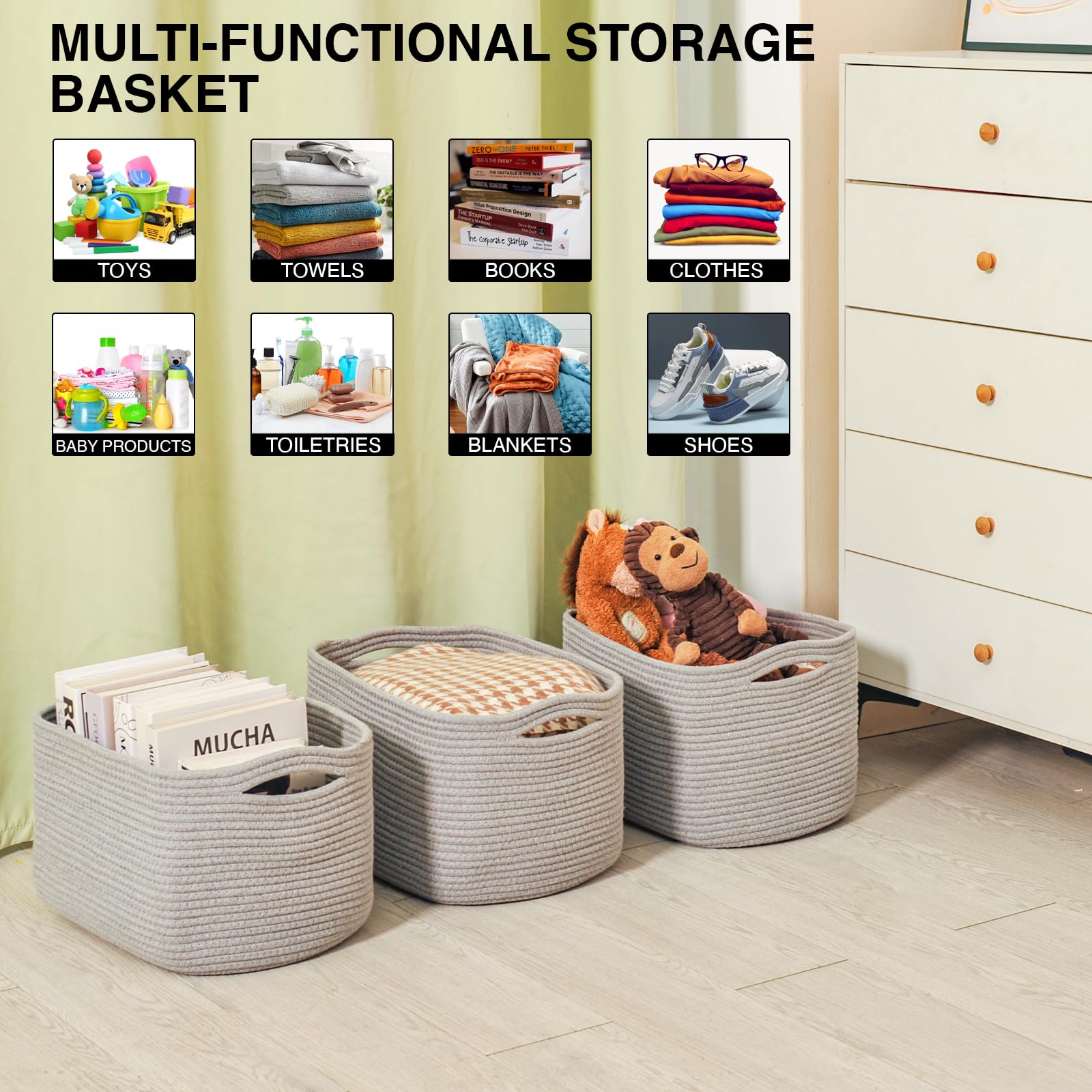 Toy Baskets Storage Kids: Made with HIGH-QUALITY hand-made cotton rope and safe for kids and pets, our rope basket is built to last. This basket for toys can withstand heavy loads while maintaining stability, providing you with peace of mind knowing it won't deform or get damaged easily