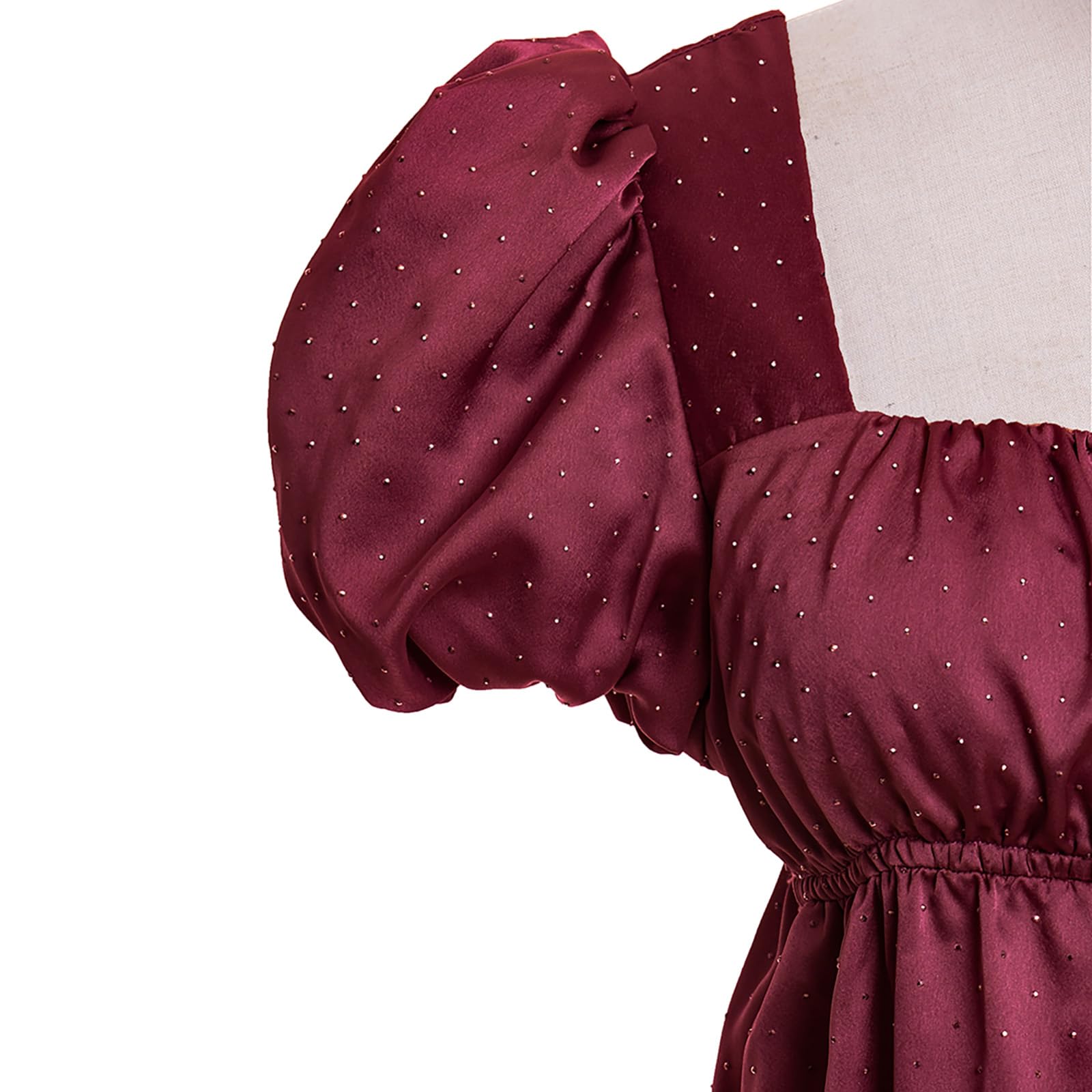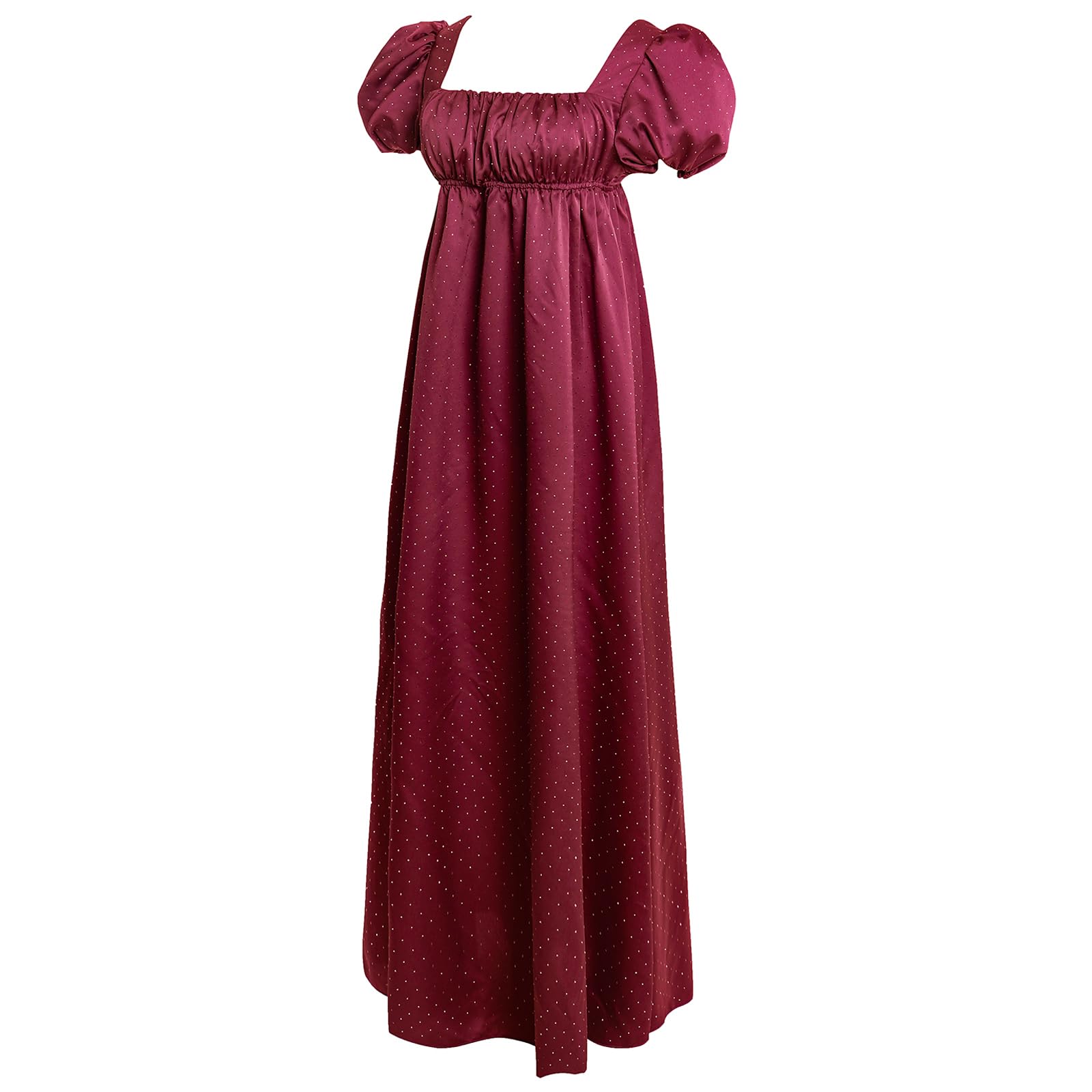 Features - This elegant regency dress is designed with simple and luxurious rhinestones satin fabric, unique puff sleeve, square neck and empire cut waist, fitted smocked back, invisible zipper at the side, elastic waistline, flared A-Line silhouette, long length.