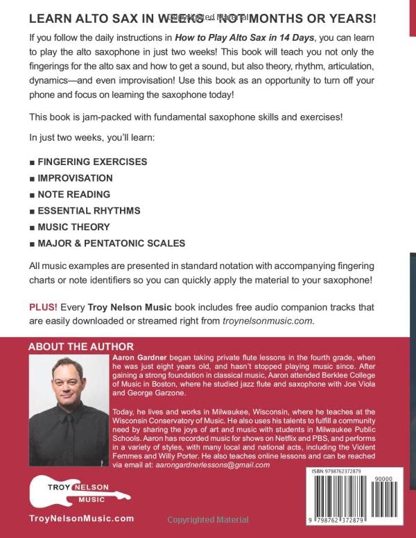 Learn how to play alto saxophone from master instructor Aaron Gardner. How to Play Alto Sax in 14 Days is the ultimate alto sax book for beginners. In this practical, step-by-step guide, saxophonist and master instructor Aaron Gardner teaches you the essential elements you need to know to get started as an alto sax player. Inside this alto sax book for beginners, you'll find short songs, melodies, and music exercises all presented in standard notion with accompanying fingering charts or note identifiers so you can quickly apply the music to your saxophone! With this book, you can learn how to play alto saxophone! Alto saxophone is no different than any other instrument, and with steady, mindful practice, you can learn to play it in just two weeks, because How to Play Alto Sax in 14 Days is written with the absolute beginner in mind! This alto sax book for beginners is jam-packed with fundamental saxophone skills and exercises! For adult beginners, teens and kids alike, in just two weeks, you’ll learn: How to Get a Sound Fingering Exercises Note Reading Essential Rhythms Music Theory Improvisation Major & Pentatonic Scales What makes this beginner alto sax book different? How to Play Alto Sax in 14 Days is an innovative method for learning to play the saxophone. The instructional material is not only easy to use and follow, but also cutting-edge in its approach. This book speeds up the learning process by including fingering charts or note identifiers in all songs, melodies, and music exercises. Contact our Customer Support via our website if you have any questions about audio files or need any other assistance. We are here for your entire learning-to-play-saxophone journey! Includes tons of music notes, easy-to-play melodies, and full songs, including a complete 12-bar blues tune for learning to play melodies and soloing over. Plus, the audio downloads include full-band backing tracks! Read it! Hear it! Play it! Music examples are presented in standard music notation with fingering charts or note identifiers. This practical, step-by-step guide to beginning alto sax includes quick-and-easy access to audio tracks via download or streaming—right from troynelsonmusic.com. No signup required! About Aaron Gardner: Aaron Gardner began taking private flute lessons in the fourth grade and hasn't stopped playing music since. After gaining a strong foundation in classical music, Aaron attended Berklee College of Music in Boston, where he studied jazz flute and saxophone with Joe Viola and George Garzone. Today, Aaron lives and works in Milwaukee, Wisconsin, where he teaches at the Wisconsin Conservatory of Music. He also uses his talents to fulfill a community need by sharing the joys of art and music with students in the Milwaukee Public Schools. Aaron has recorded music for shows on Netflix and PBS, and performs in a variety of styles, with many local and national acts, including the Violent Femmes and Willy Porter. REMEMBER: Free access to instant streaming or audio downloads from troynelsonmusic.com is included. Thanks for the 5-star reviews! Publisher Troy Nelson has garnered 1000s of 5-star reviews through his breakthrough series How to Play Music in 14 Days. Get this book—and the Troy Nelson Music support system—today!