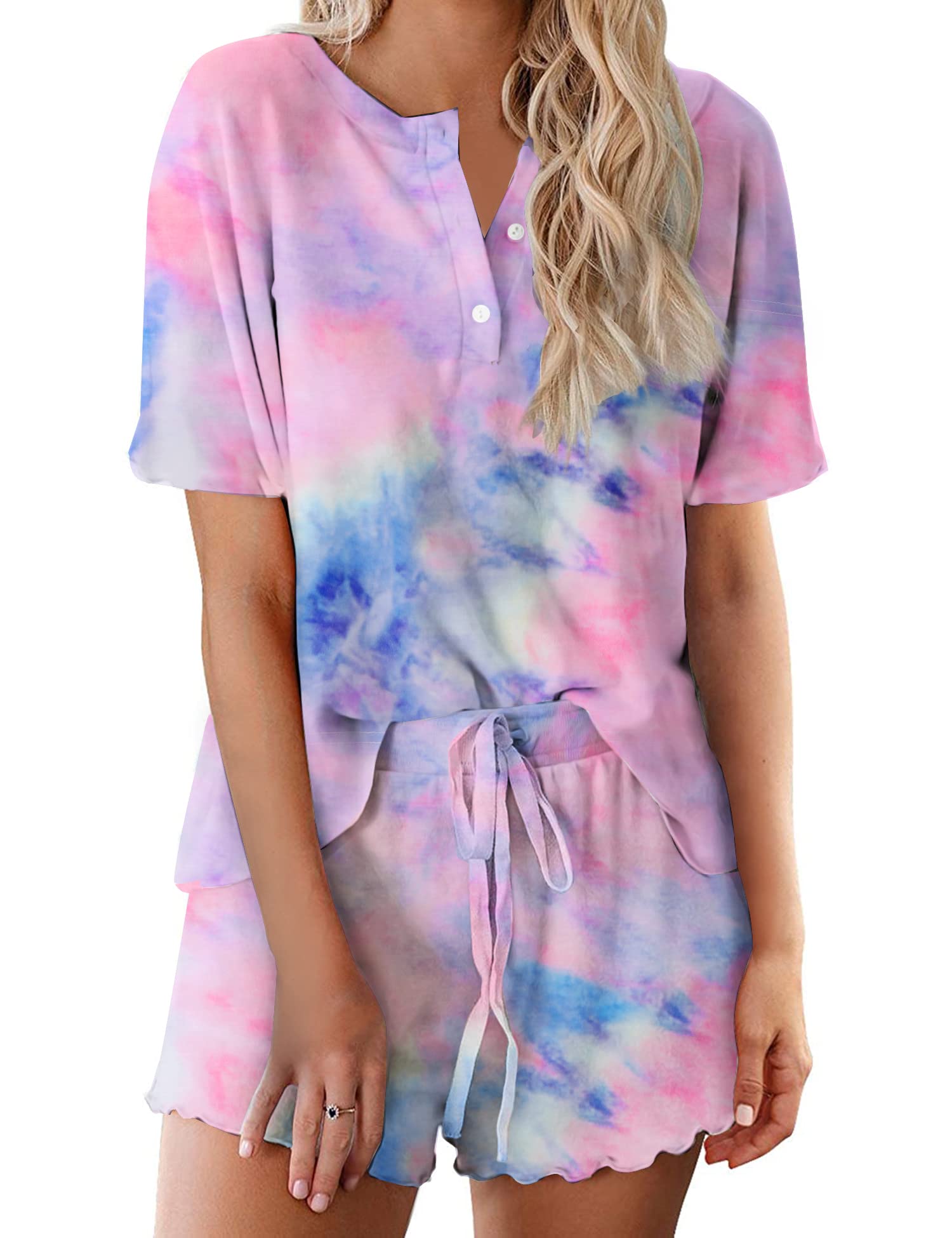 [Women Two Piece Pajama Set]: Soft and comfy loungewear nightwear fits for all seasons. Sleep in the daily casual Short Sleeve PJs is not only ultra-comfortable but also stylish. Jersey material feels as smooth & light as air breathing on your skin. Classic crewneck with buttons, elastic drawstring waistband is easy to dress up or down; New chic tie dye patterned, suitbale for working/ relaxing at home, lounging out or dreaming under the sunshine